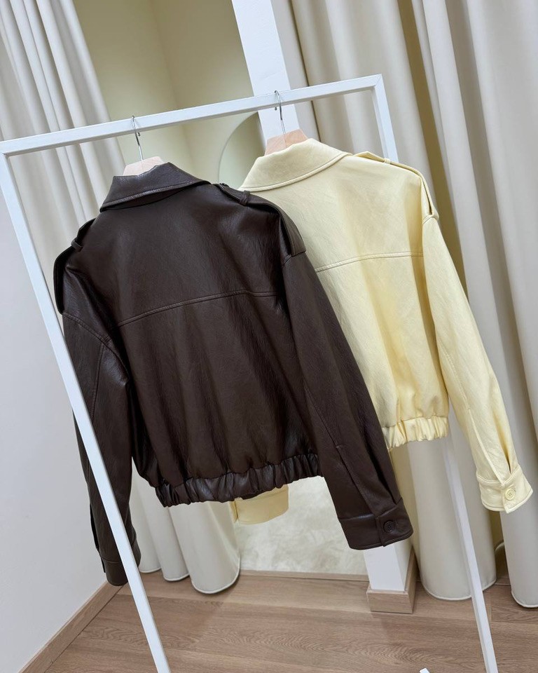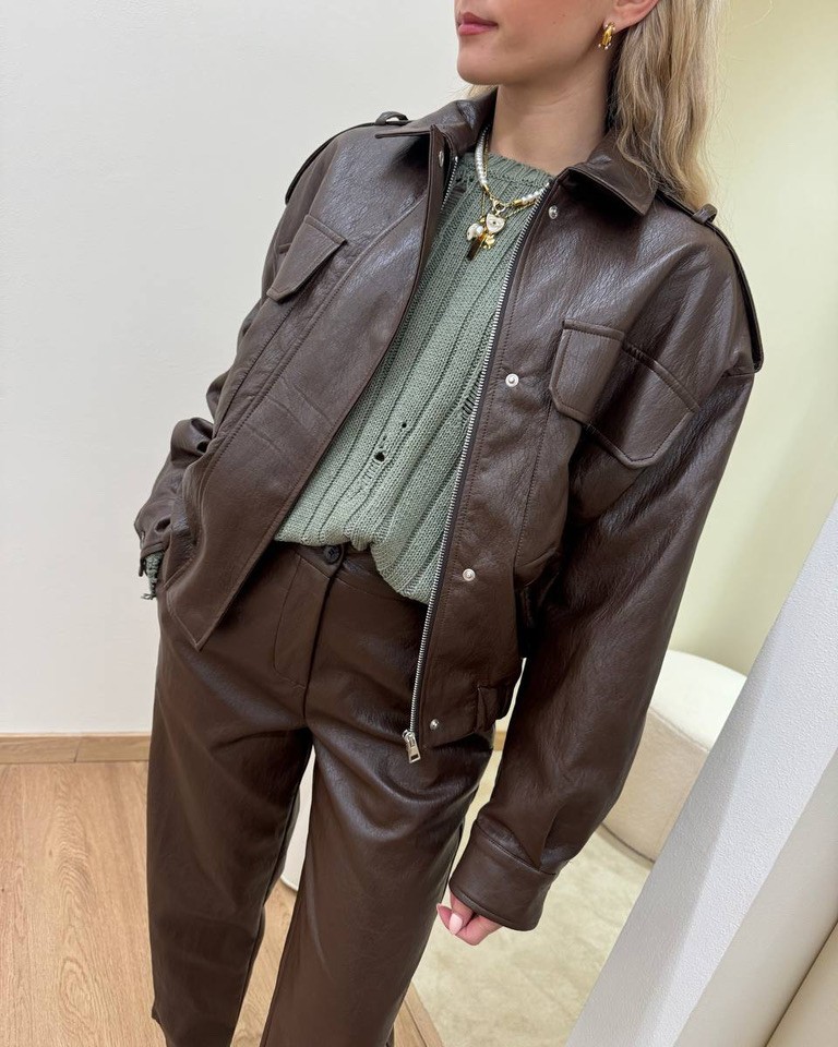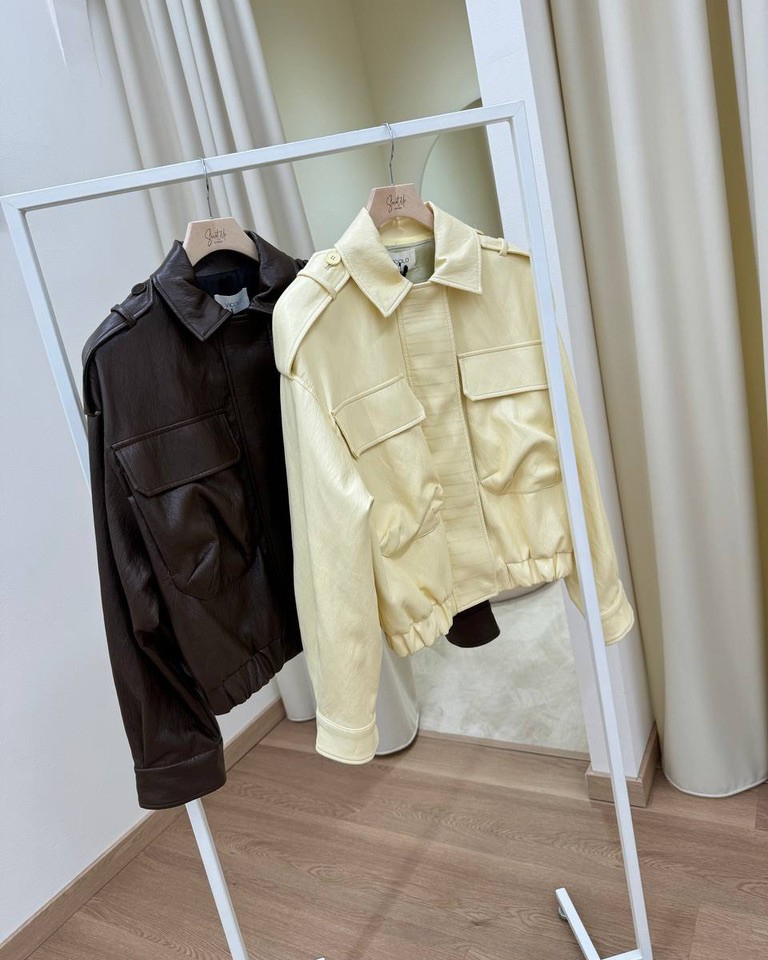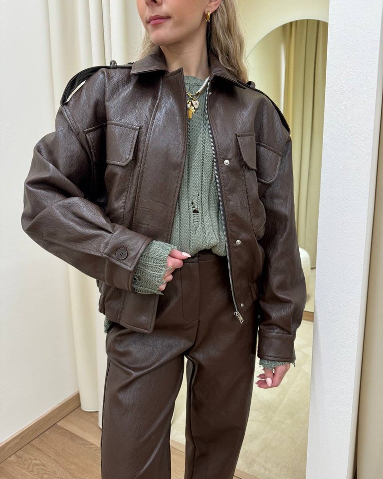 Bomber in ecopelle moro. Modello oversize con tasconi davanti, maniche lunghe, colletto a camicia e alamari con bottone sulle spalle, orlo con elastico, foderato. Chiusura con zip e bottoni automatici. Vestibilità ampia.