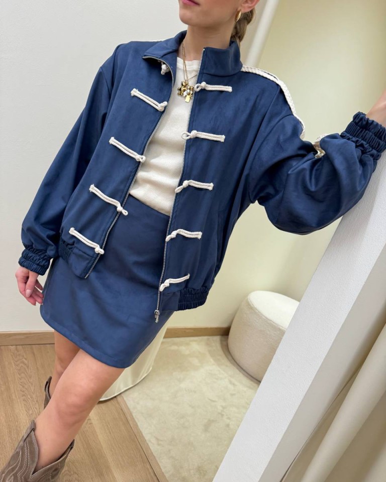 Bomber in tessuto leggere scamosciato all’interno ed esterno color blu, modello over, a collo alto, manica lunga con dettagli in corda avorio con elastico su polsi e fondo, tasche davanti, chiusura con zip e alamri. Vestibilità ampia.
