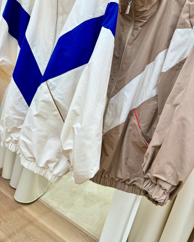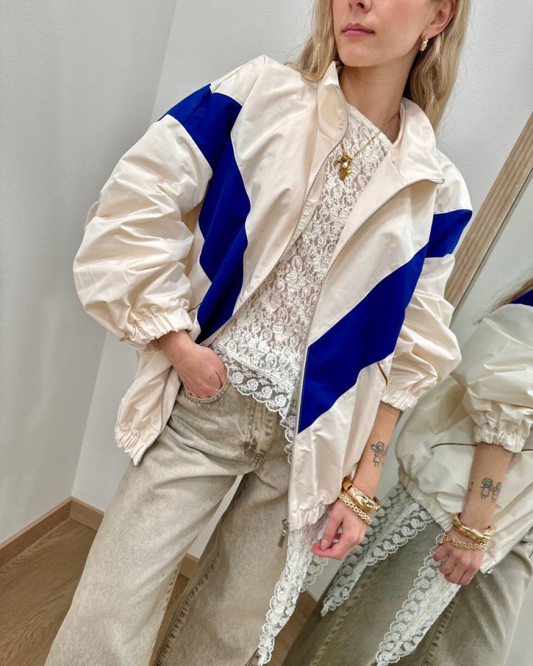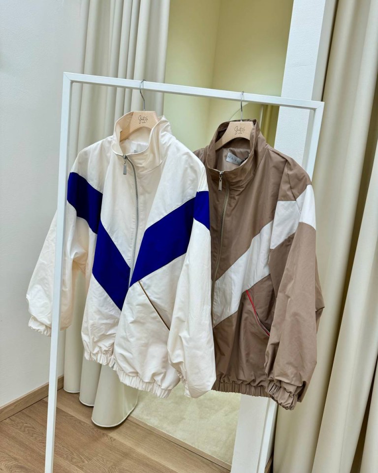 Bomber in tessuto tecnico color panna e taglio geometrico blu acceso con profili tasche color cammello a contrasto, modello over a collo alto, maniche lunghe con giro sceso ed elastico sui polsi, orlo arricciato con elastico, chiusura frontale con zip. Foderato. Vestibilità ampia.