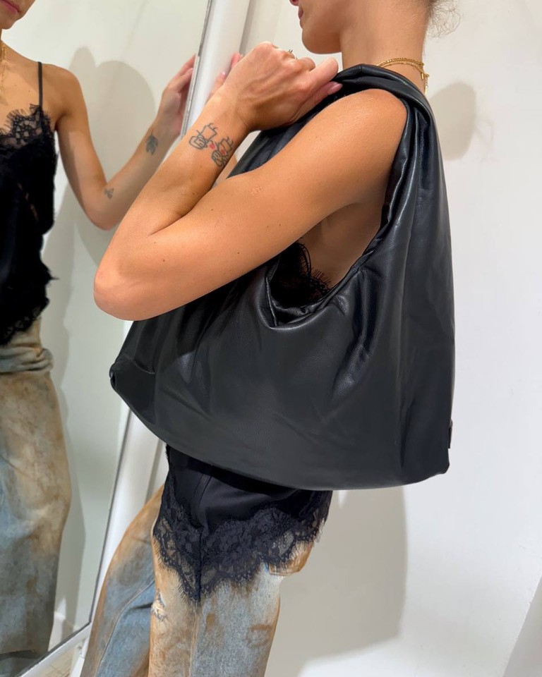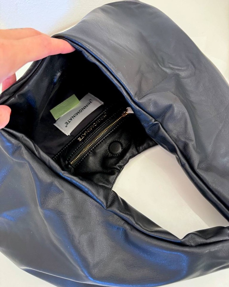 Borsa grande nera in ecopelle morbida, modello a mano a forma di luna con manico unico. Chiusura con bottone interno a calamita.