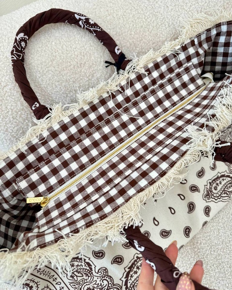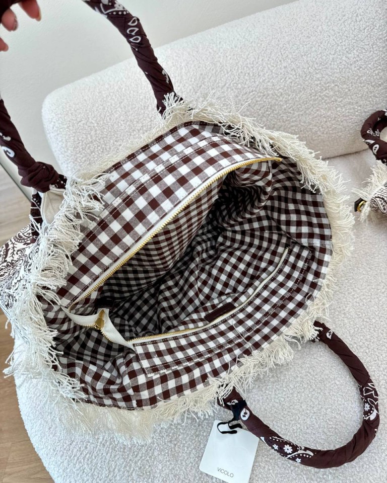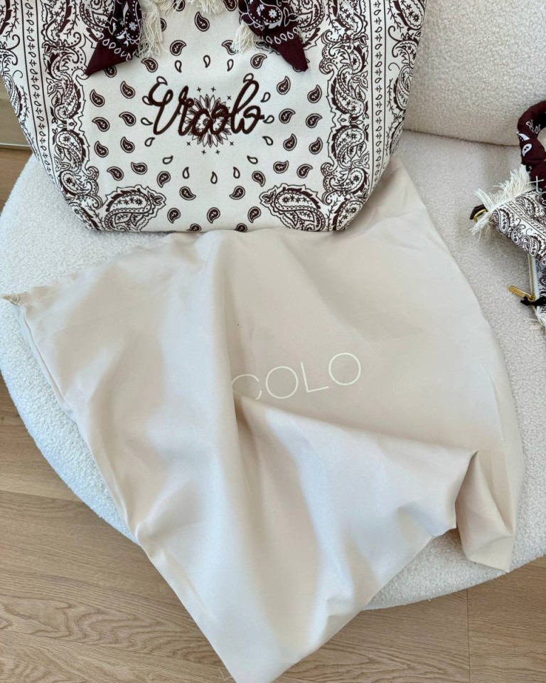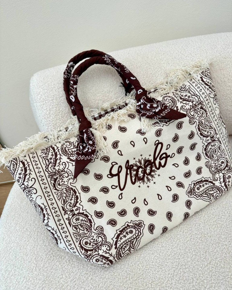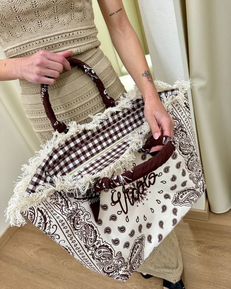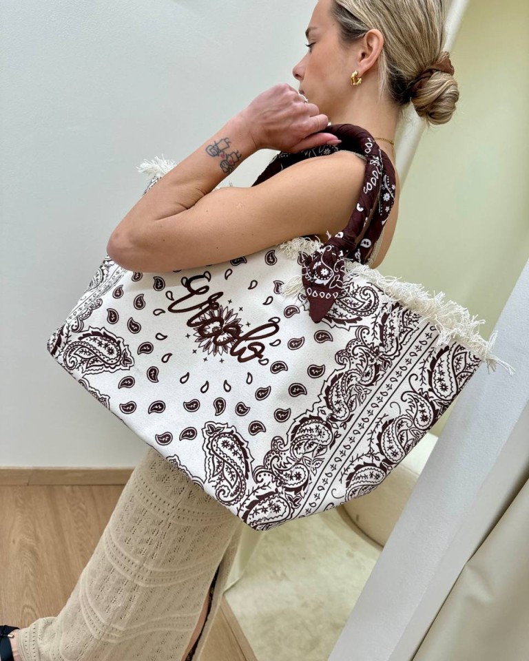 Borsa Ibiza maxi in canvas di cotone burro con stampa paisley moro, manici rigidi con bandana moro, bordo sfrangiato, chiusura con zip. tracolla removibile.