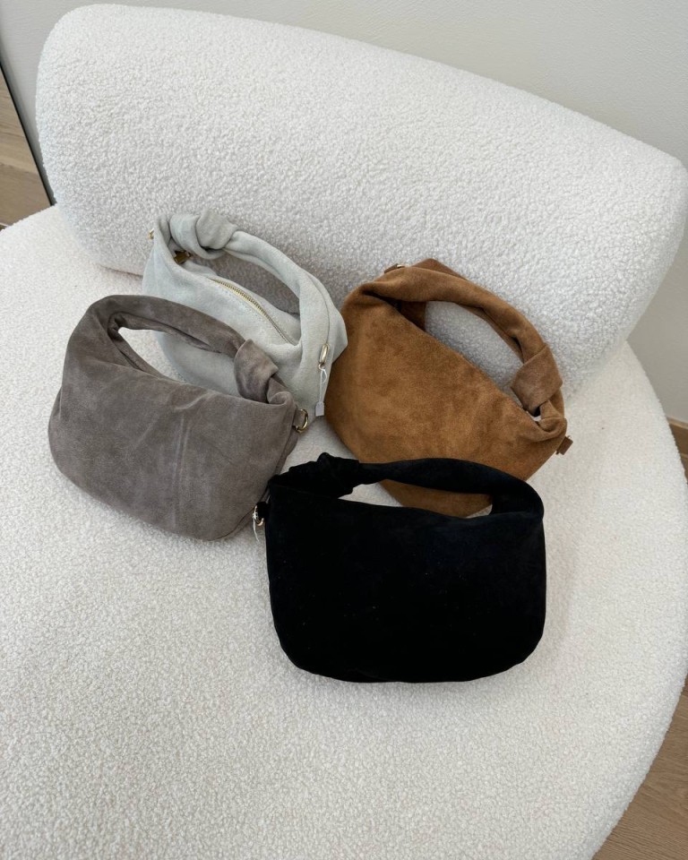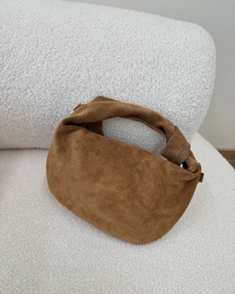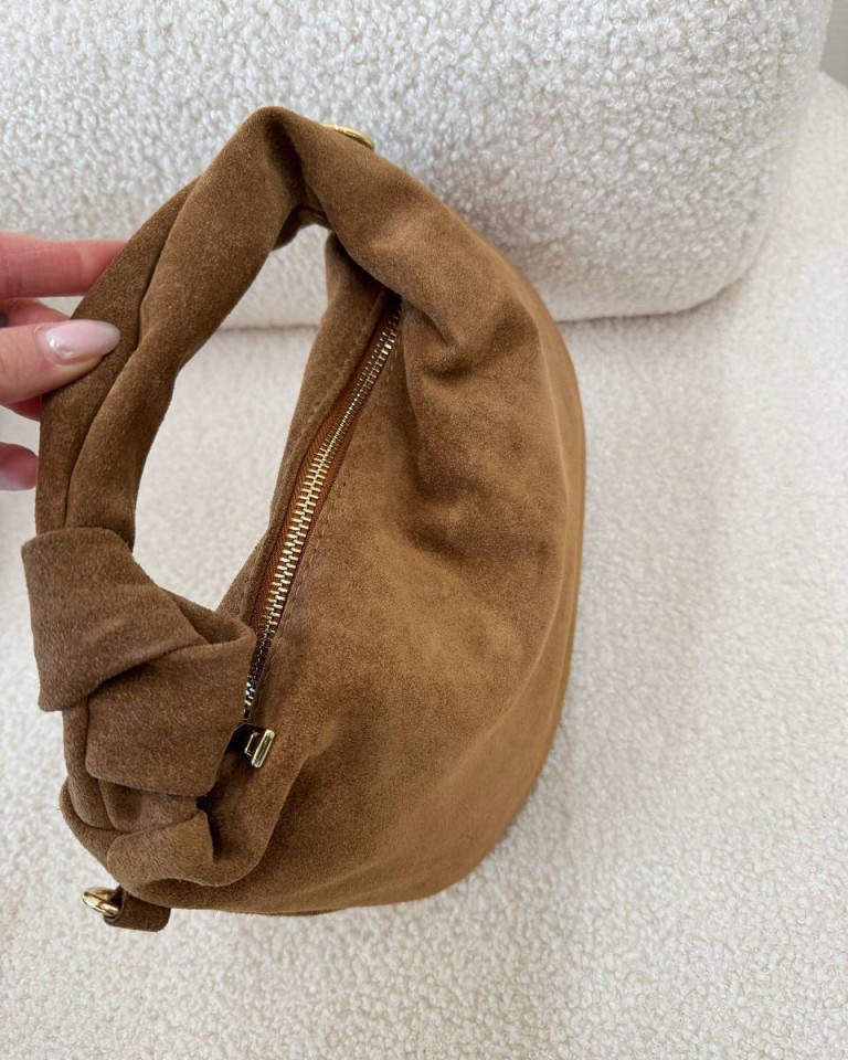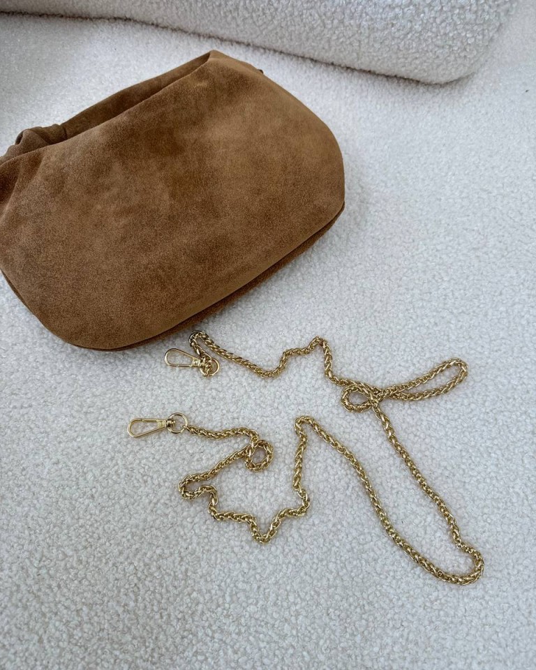 Borsa mini in vera pelle scamosciata color bruciato, modello luna con manico morbido con nodo, chiusura con cerniera e tracolla catena in metallo dorata rimovibile.