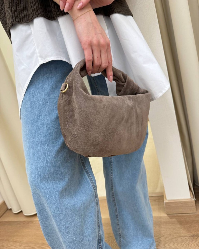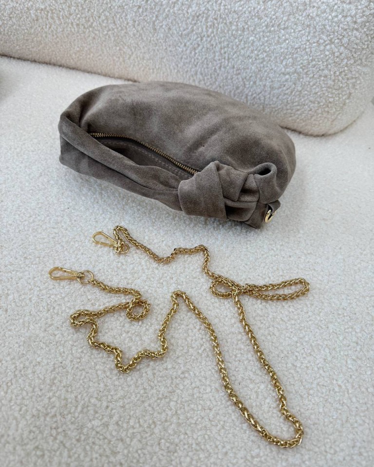 Borsa mini in vera pelle scamosciata color tortora, modello luna con manico morbido con nodo, chiusura con cerniera e tracolla catena in metallo dorata rimovibile.