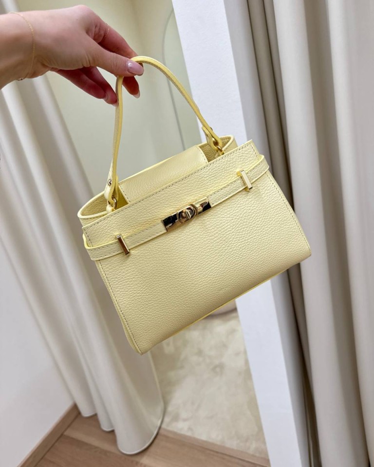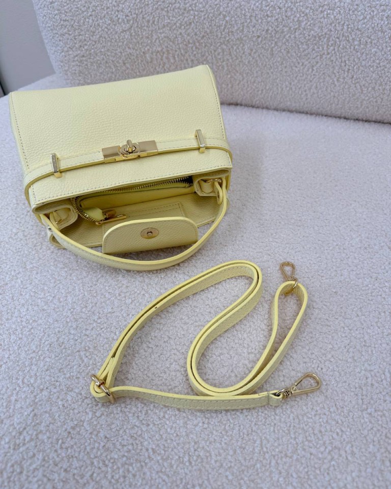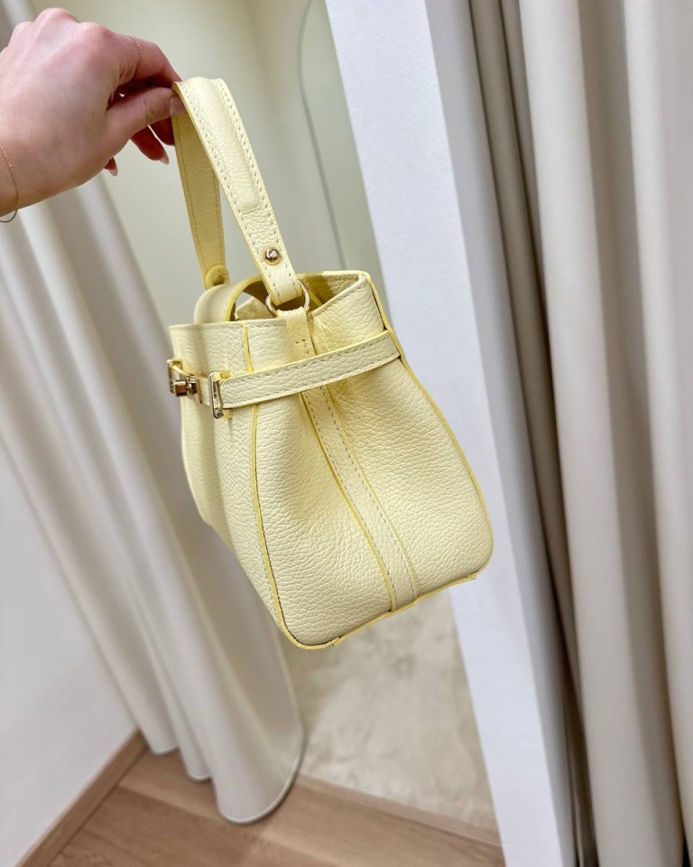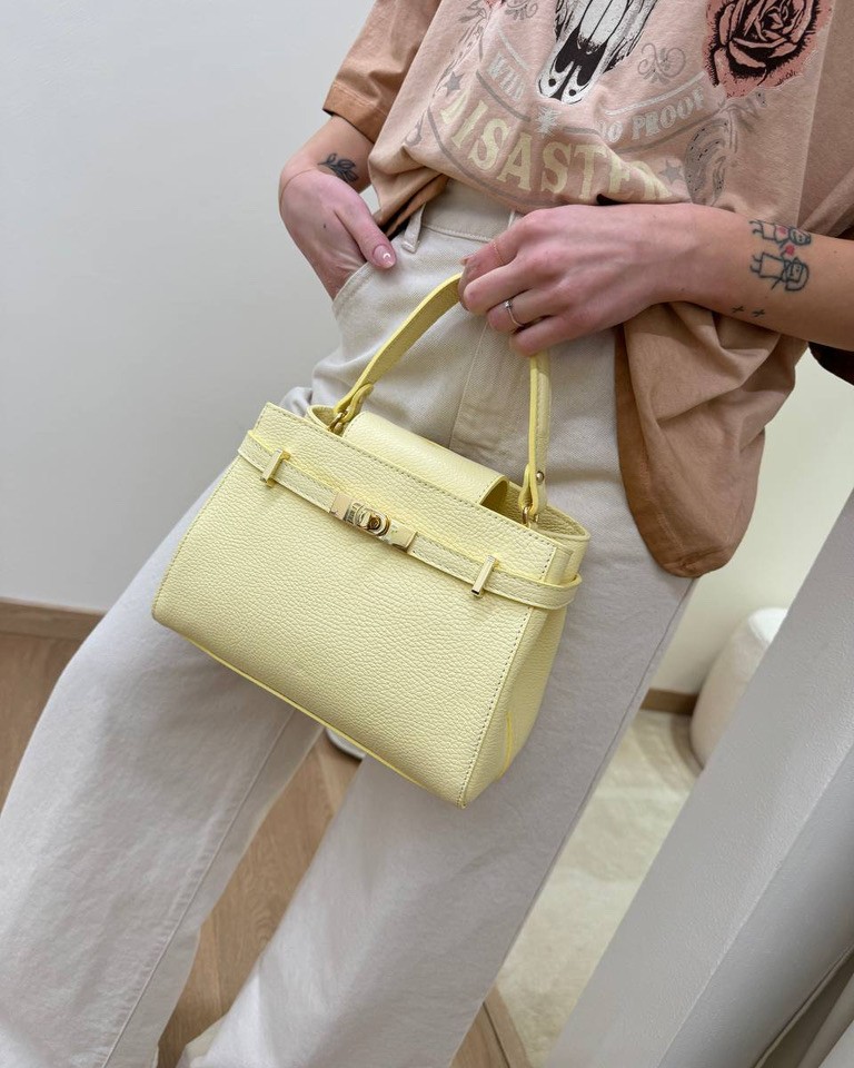 Borsa in vera pelle color giallo pastello, modello mini cartella con chiusura fibbia sul davanti, bottone interno e tracolla in pelle rimovibile.