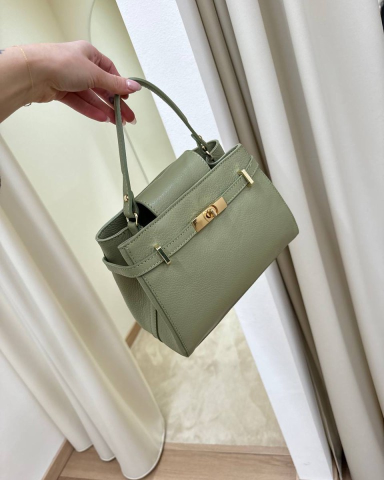 Borsa in vera pelle color verde salvia, modello mini cartella con chiusura fibbia sul davanti, bottone interno e tracolla in pelle rimovibile.
