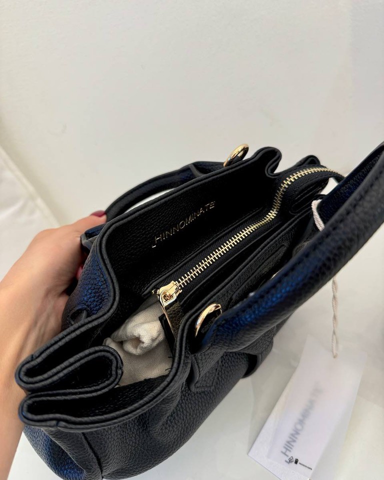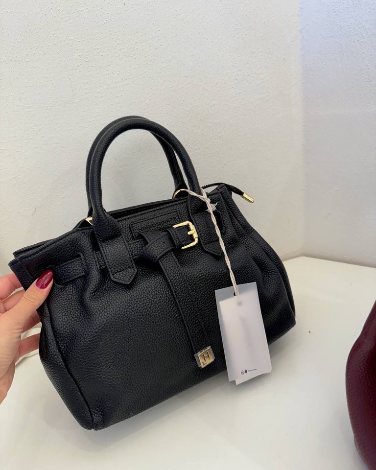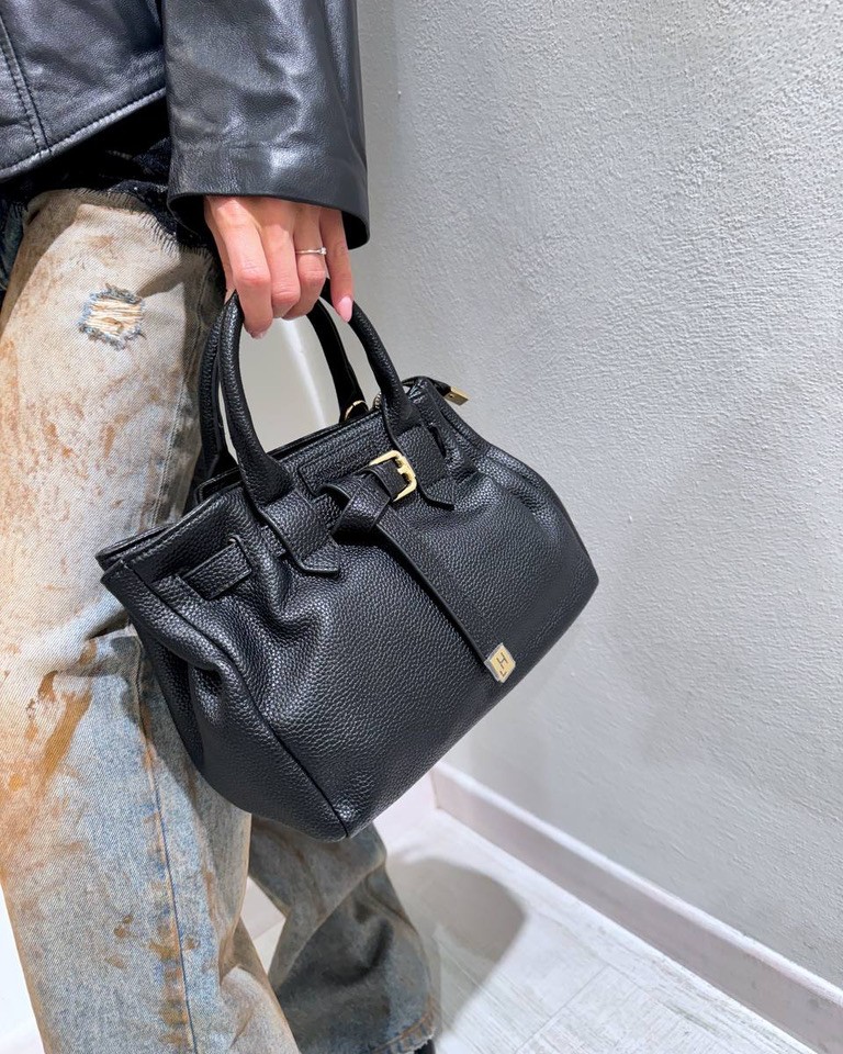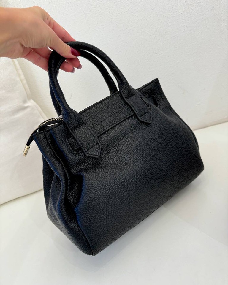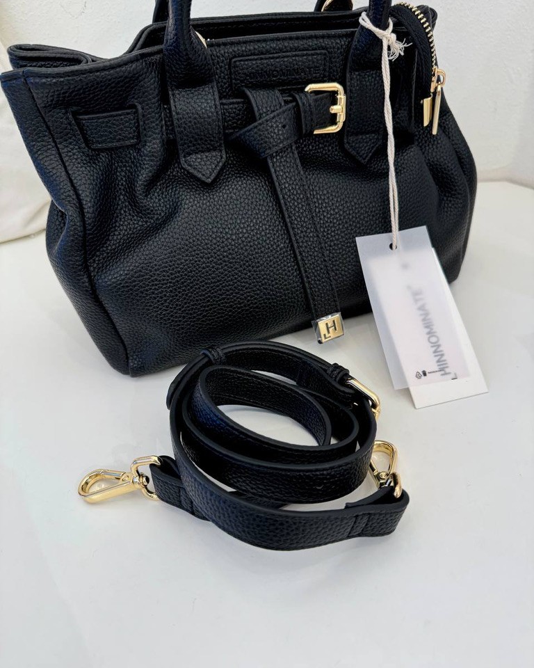 Borsa nera in ecopelle modello con dettaglio cintura manici rigidi e tracolla rimovibile e regolabile. Chiusura con cerniera in dettagli oro.