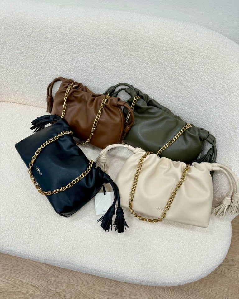 Borsa in ecopelle avorio a spalla con catena dorata logata removibile, modello pouch morbido. Bordo arricciato regolabile. Chiusura con bottoni a pressione con calamita e coulisse con nappine. Tasca interna con cerniera e taschina piatta. Misura: L. 25 cm x P. 8 cm x A. 16 cm. Lunghezza tracolla: 29 cm.