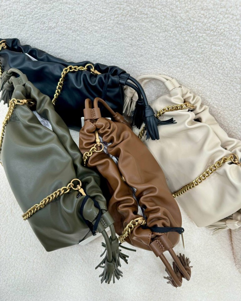 Borsa in ecopelle verde militare a spalla con catena dorata logata removibile, modello pouch morbido. Bordo arricciato regolabile. Chiusura con bottoni a pressione con calamita e coulisse con nappine. Tasca interna con cerniera e taschina piatta. Misura: L. 36 cm x P. 12 cm x A. 24 cm. Lunghezza tracolla: 29 cm.