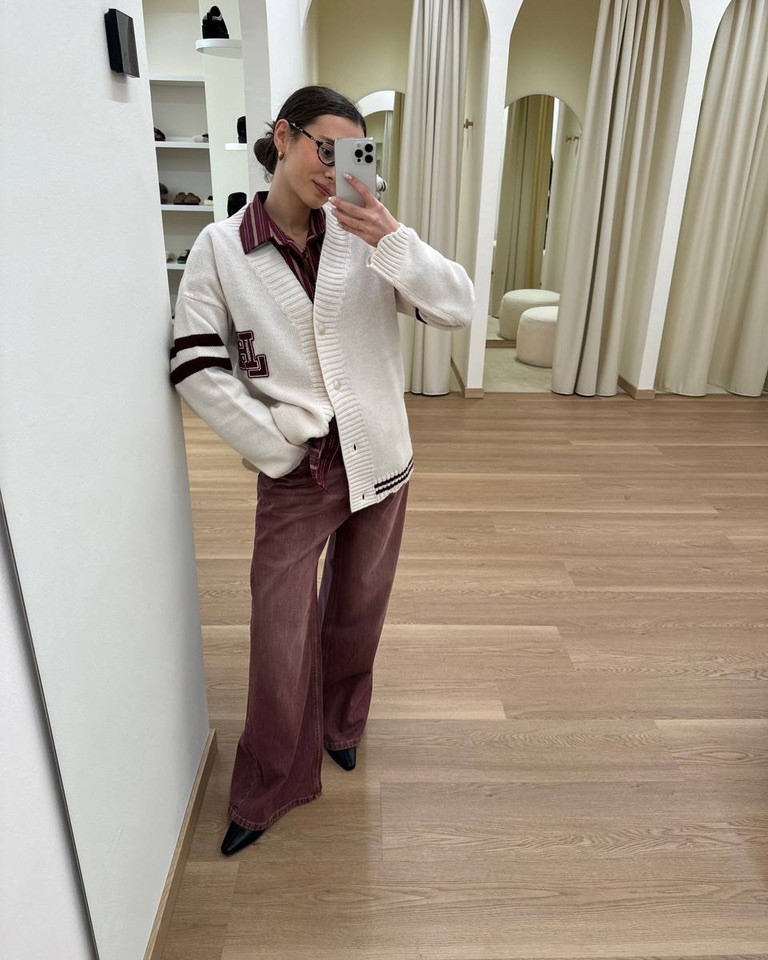 Un look d’ispirazione college rivisitato in chiave contemporanea. Il cardigan panna con dettagli a contrasto e applicazione ricamata si abbina a una camicia a righe color borgogna, creando un elegante gioco di stratificazioni. I pantaloni ampi in denim bordeax, slanciano la silhouette e donano un’allure sofisticata ma rilassata. Perfetto per un’eleganza quotidiana dal gusto rétro.