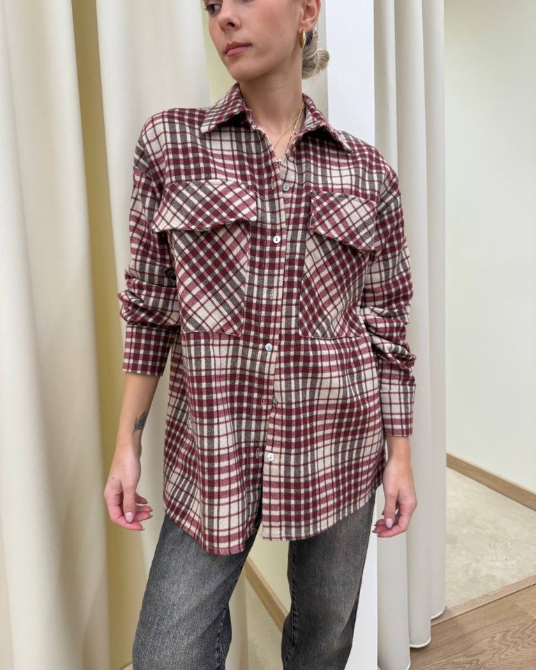 Camicia oversize mini check in flanella di cotone sui toni del rosso e beige, con maxi tasche sul davanti.