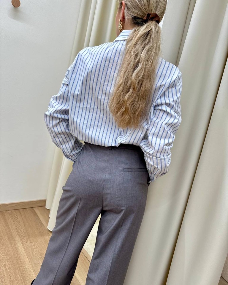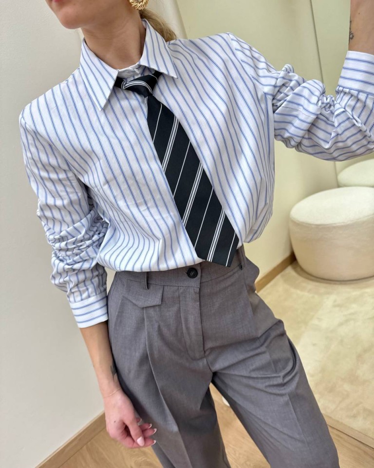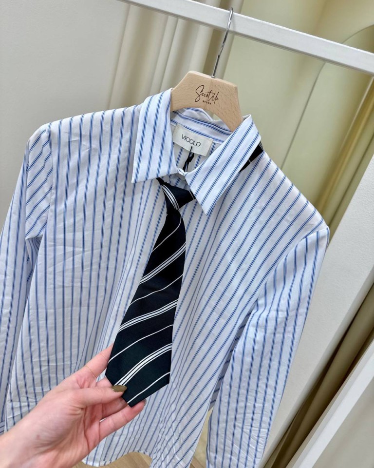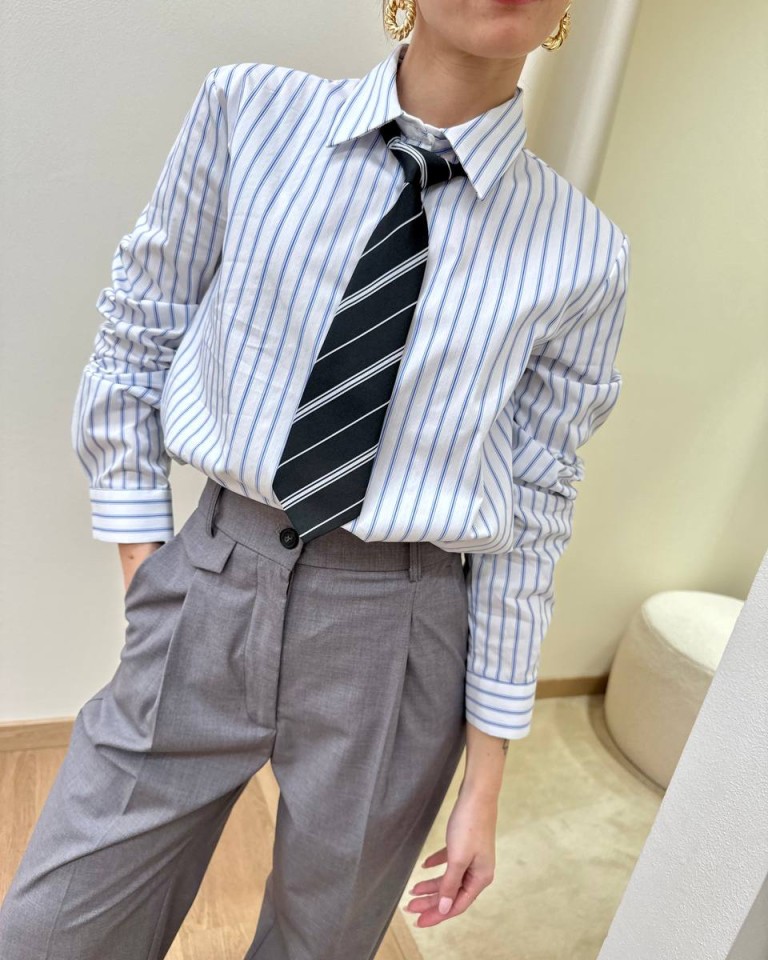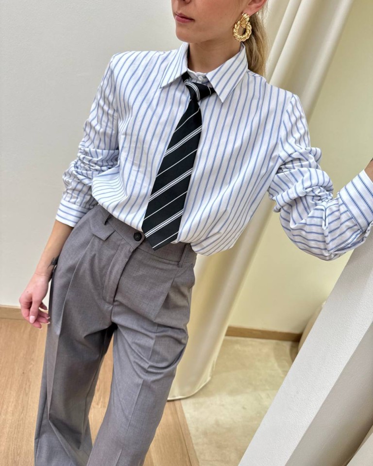 Camcia a righe bianca e celeste con cravatta rimovibile, modello dritto, manica lunga e abbottonatura davanti. Vestibilità regolare.