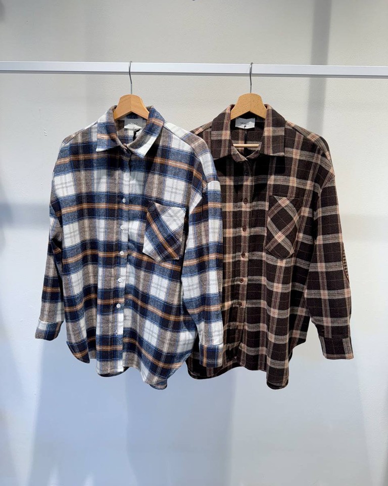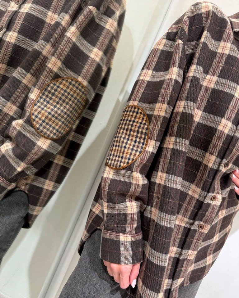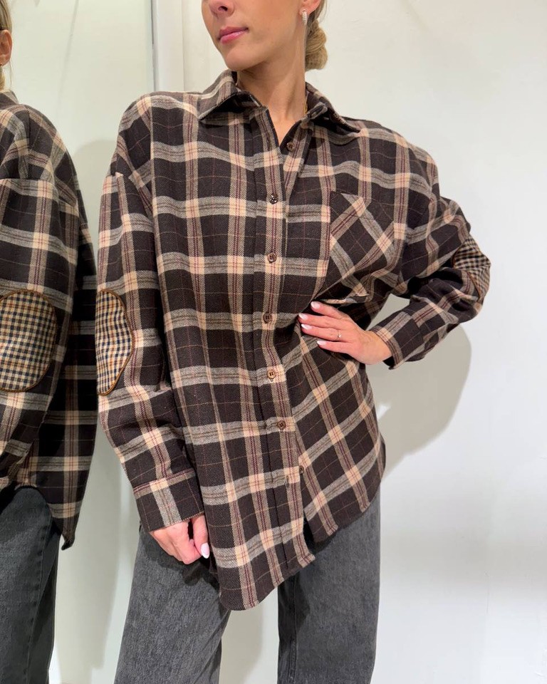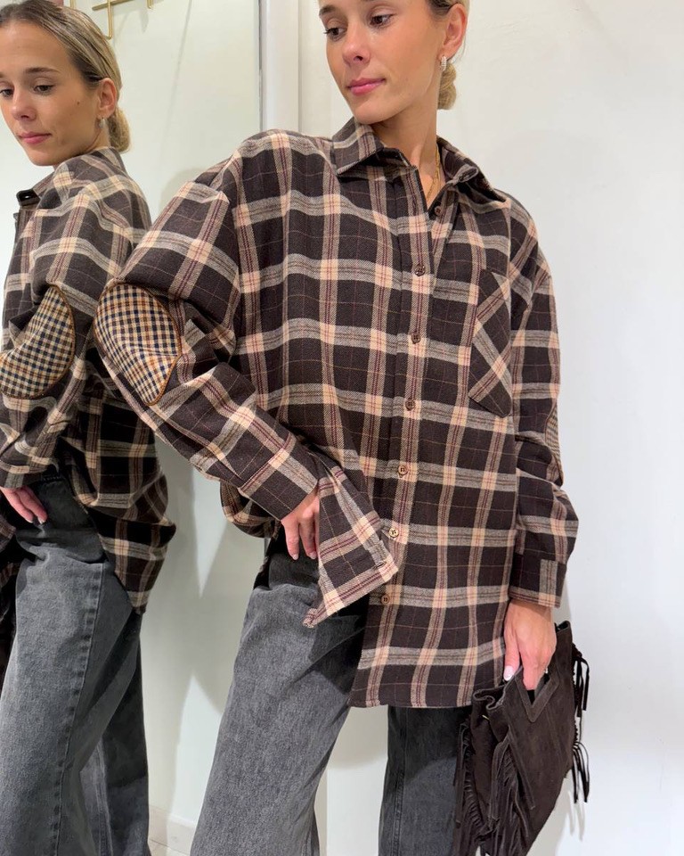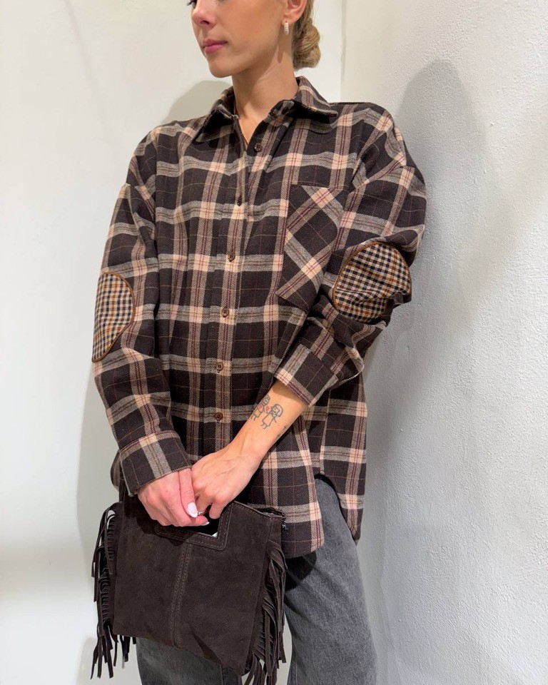 Camicia check moro in flanella di cotone, modello oversize con maniche lunghe e dettaglio patch sui gomiti, colletto e chiusura frontale con bottoni. Tasca laterale. Vestibilità ampia.