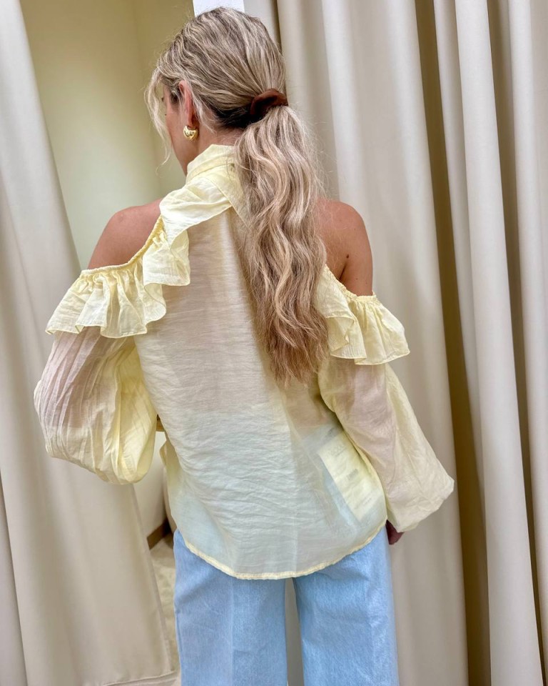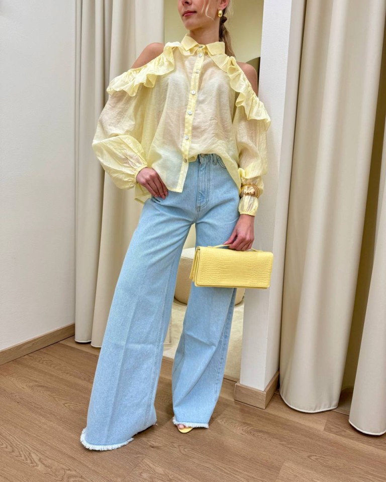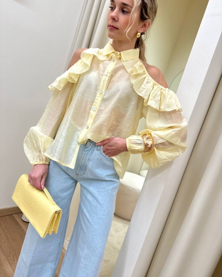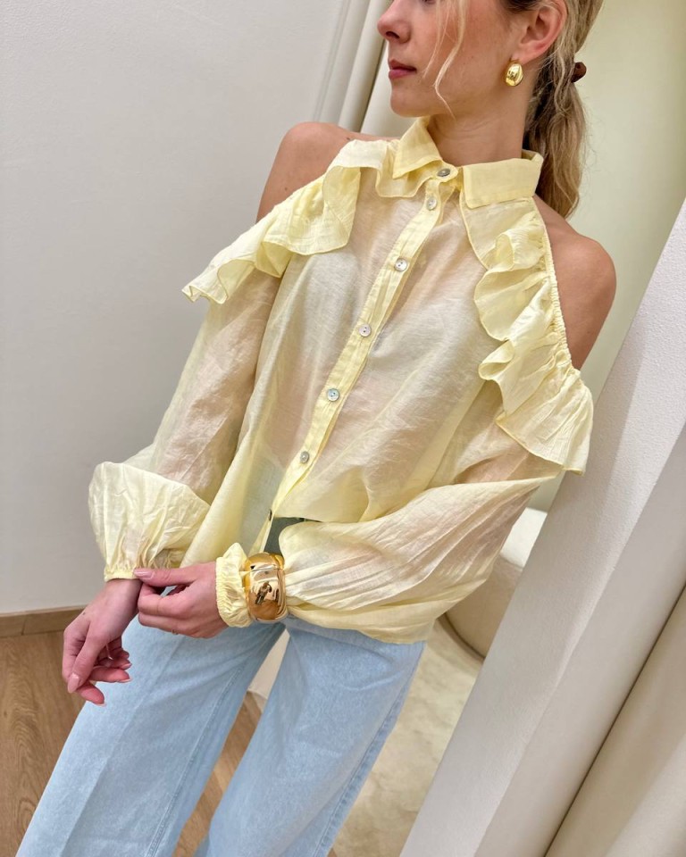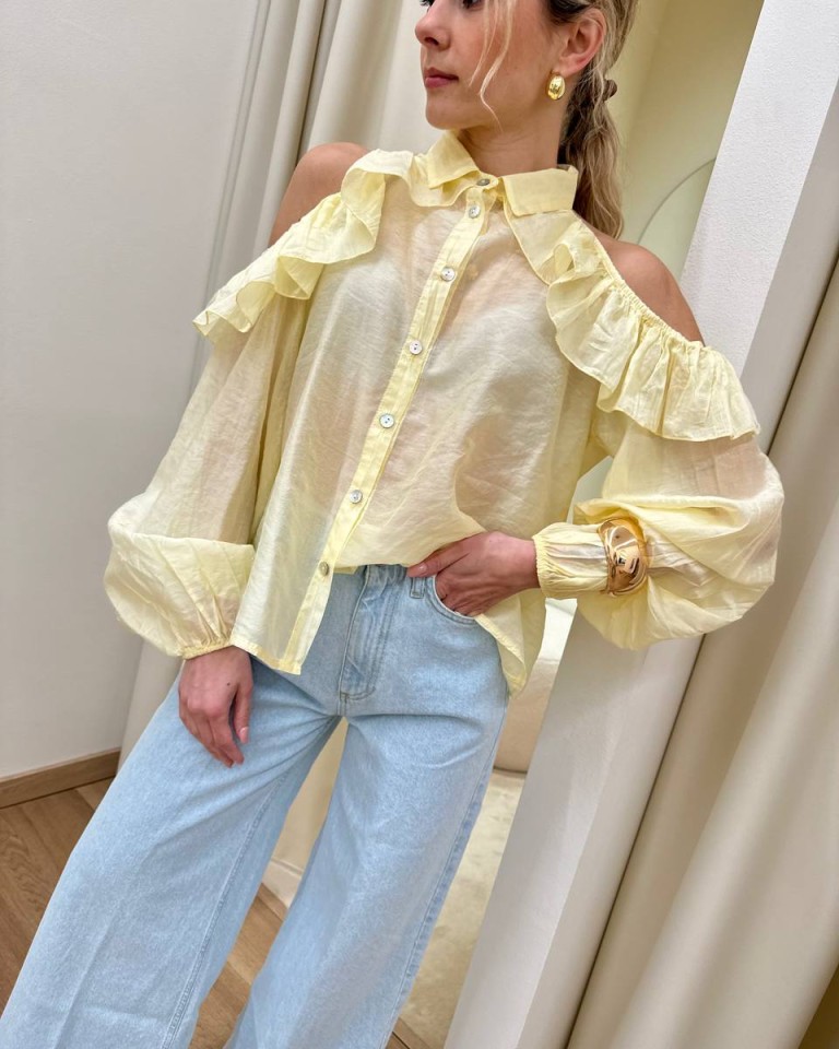 Camicia in mussola semitrasparente giallo pastello, modello over con colletto, cut out sulle spalle con rouches, maniche lunghe con elastico e arricciatura sul fondo. Vestibilità ampia.