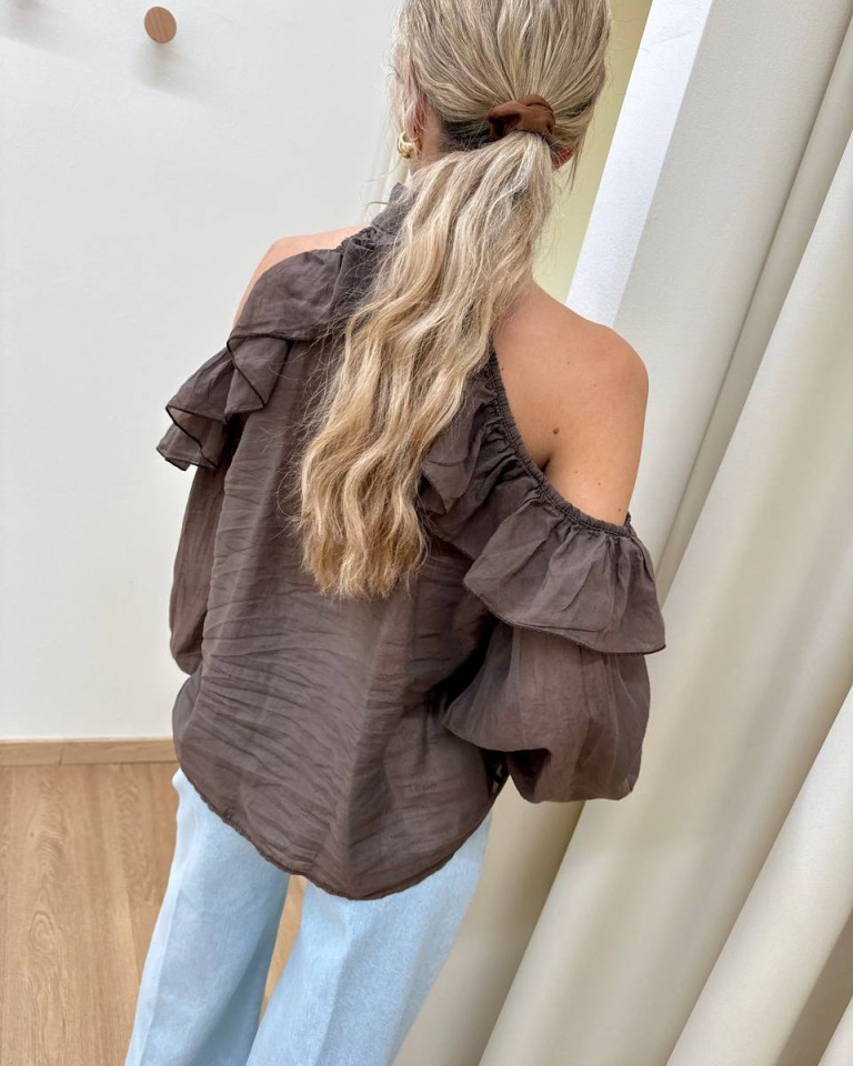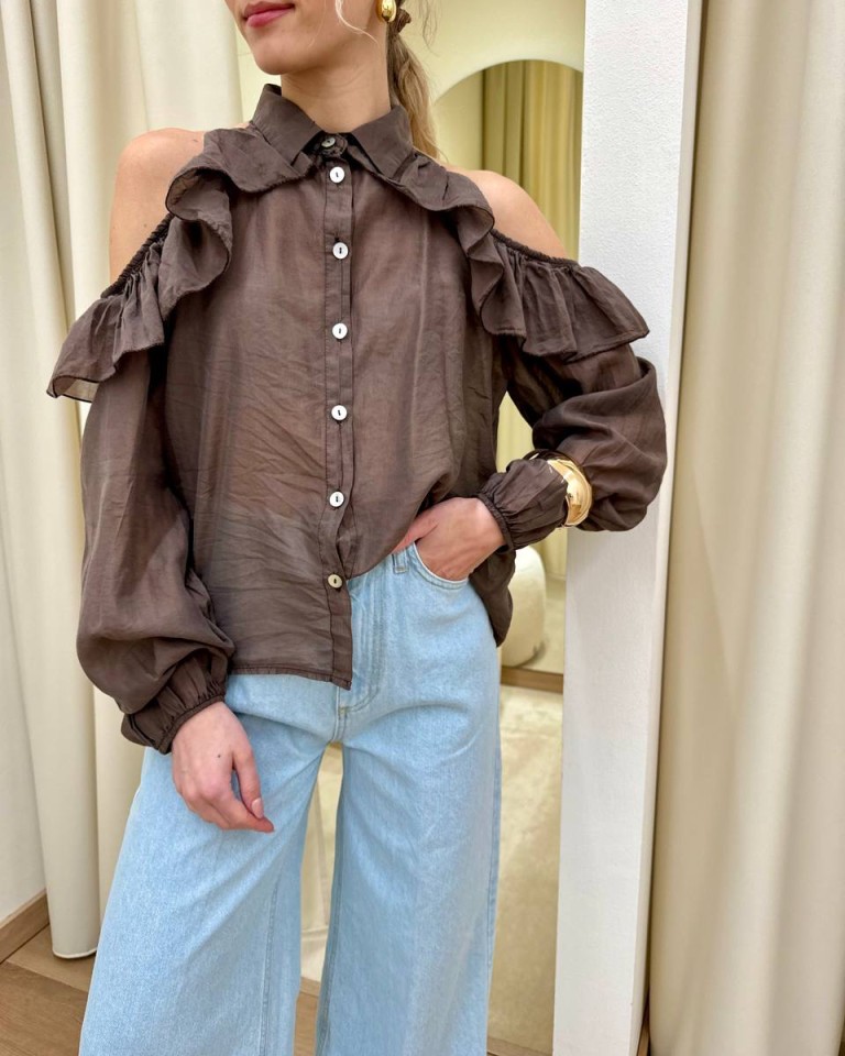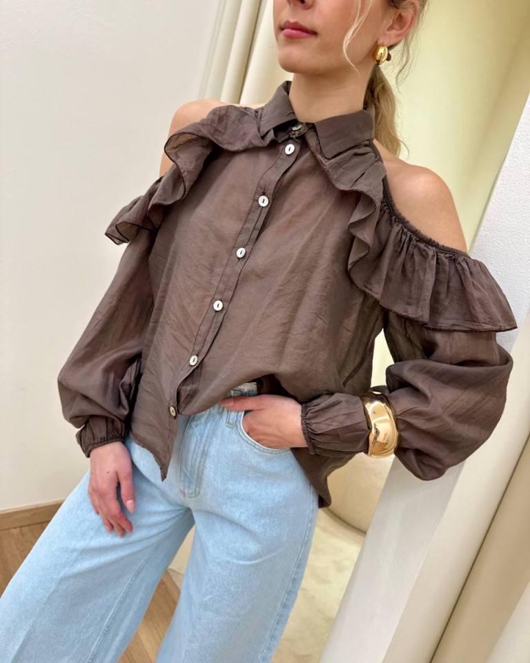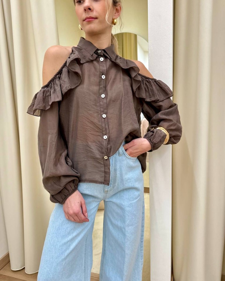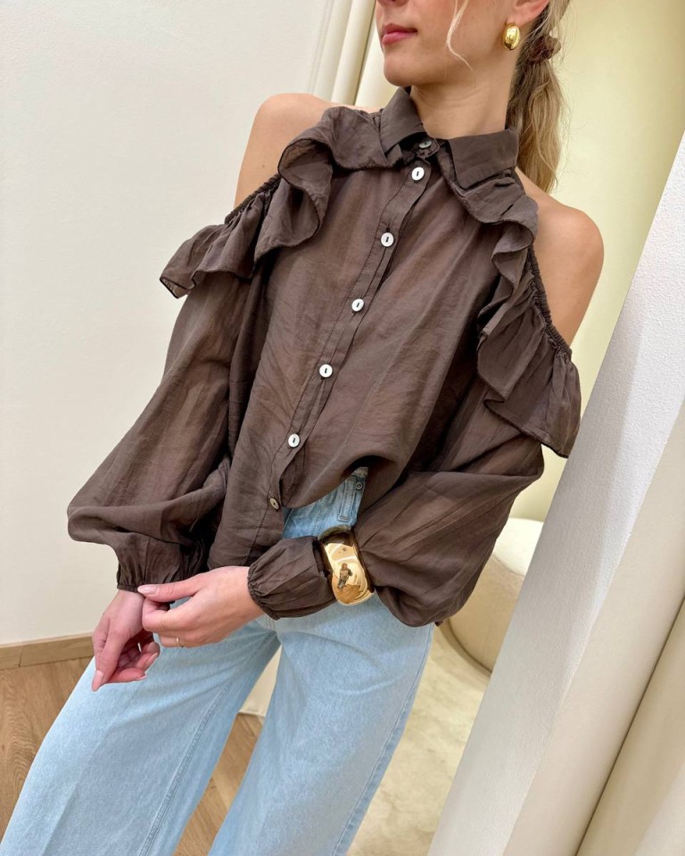 Camicia in mussola semitrasparente moro, modello over con colletto, cut out sulle spalle con rouches, maniche lunghe con elastico e arricciatura sul fondo. Vestibilità ampia.
