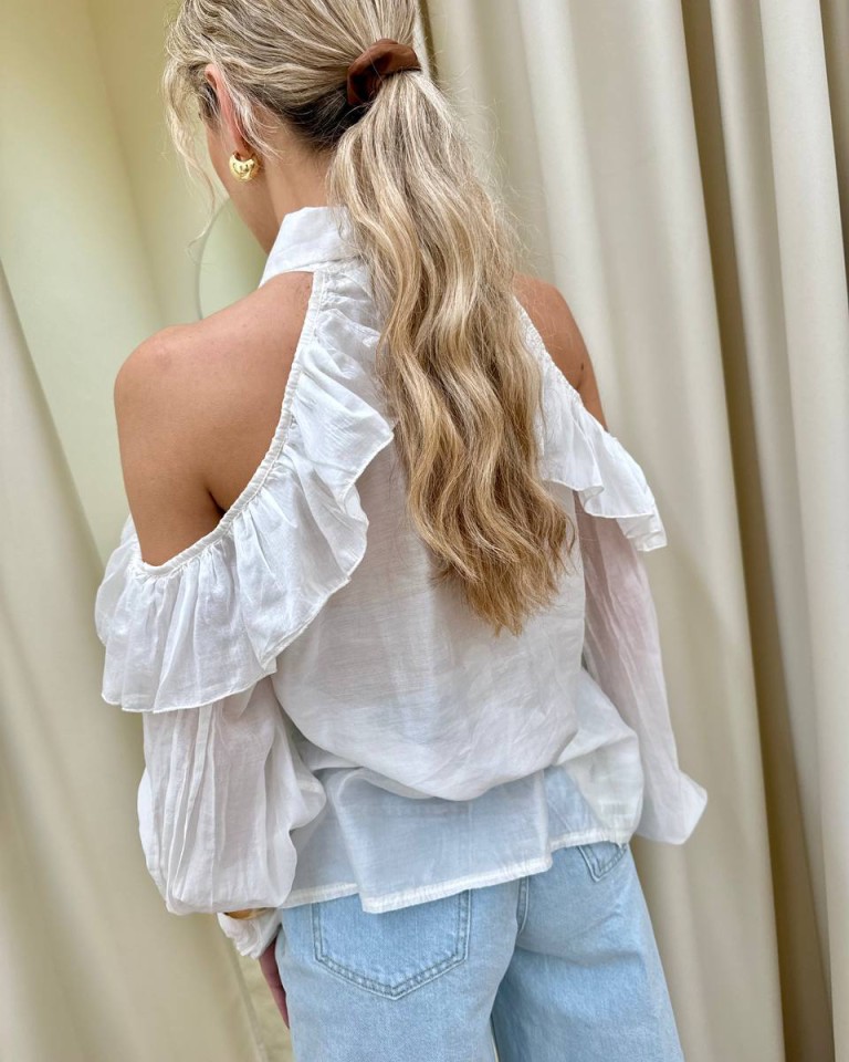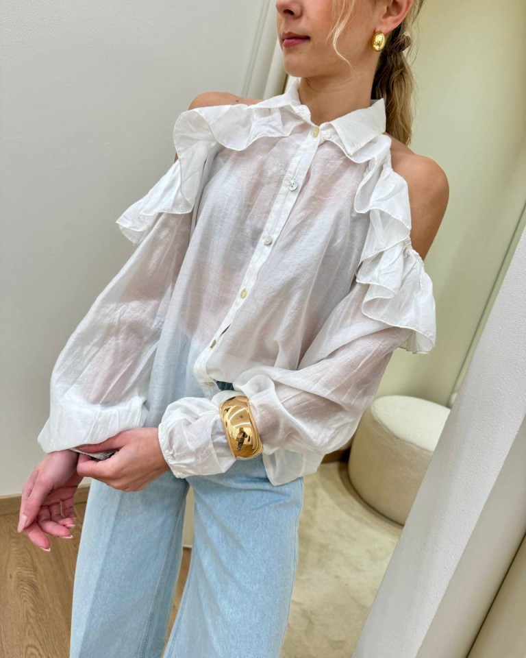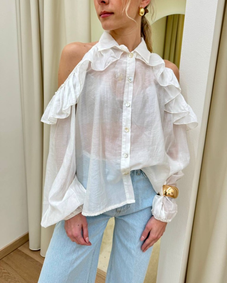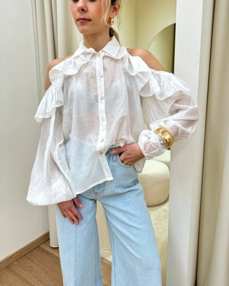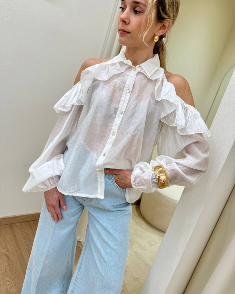 Camicia in mussola semitrasparente panna, modello over con colletto, cut out sulle spalle con rouches, maniche lunghe con elastico e arricciatura sul fondo. Vestibilità ampia.