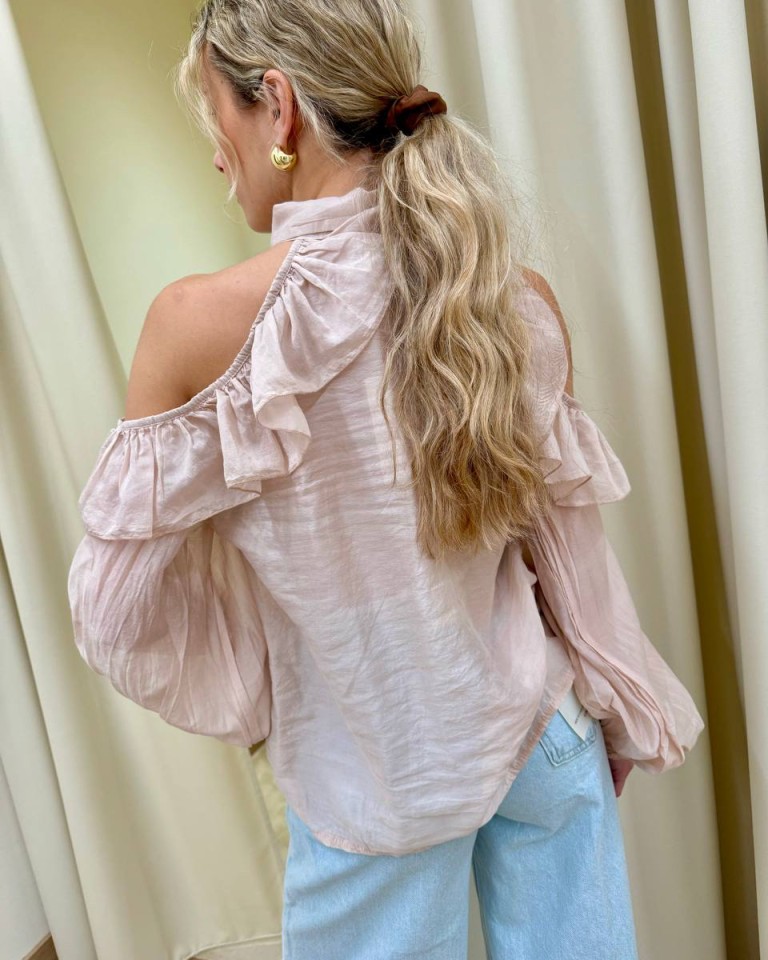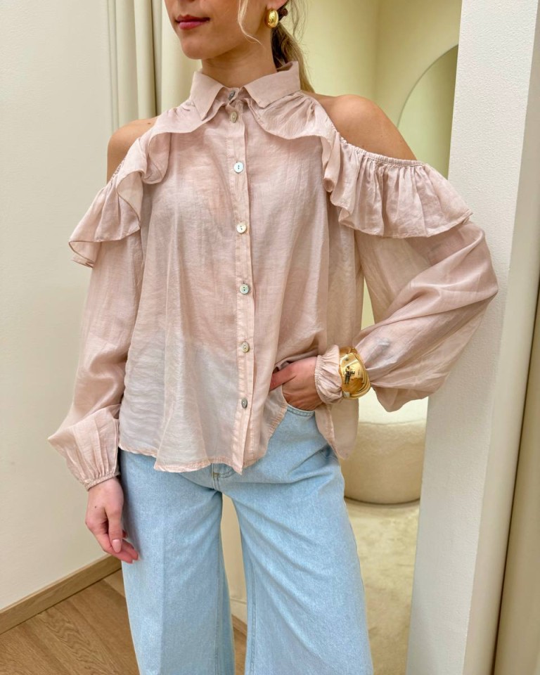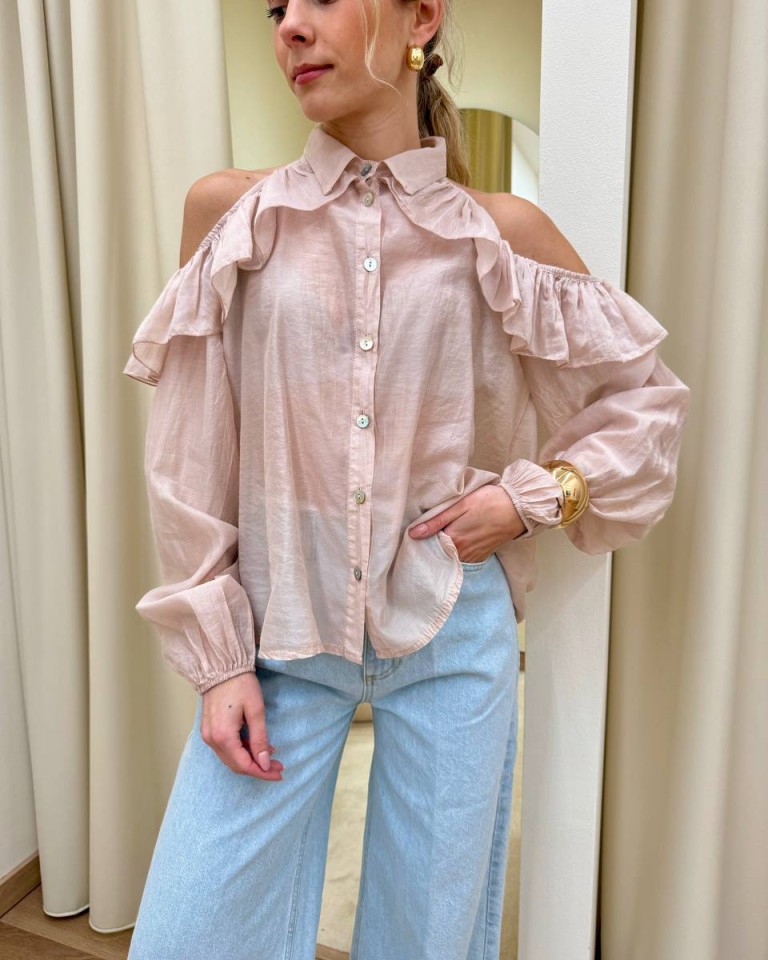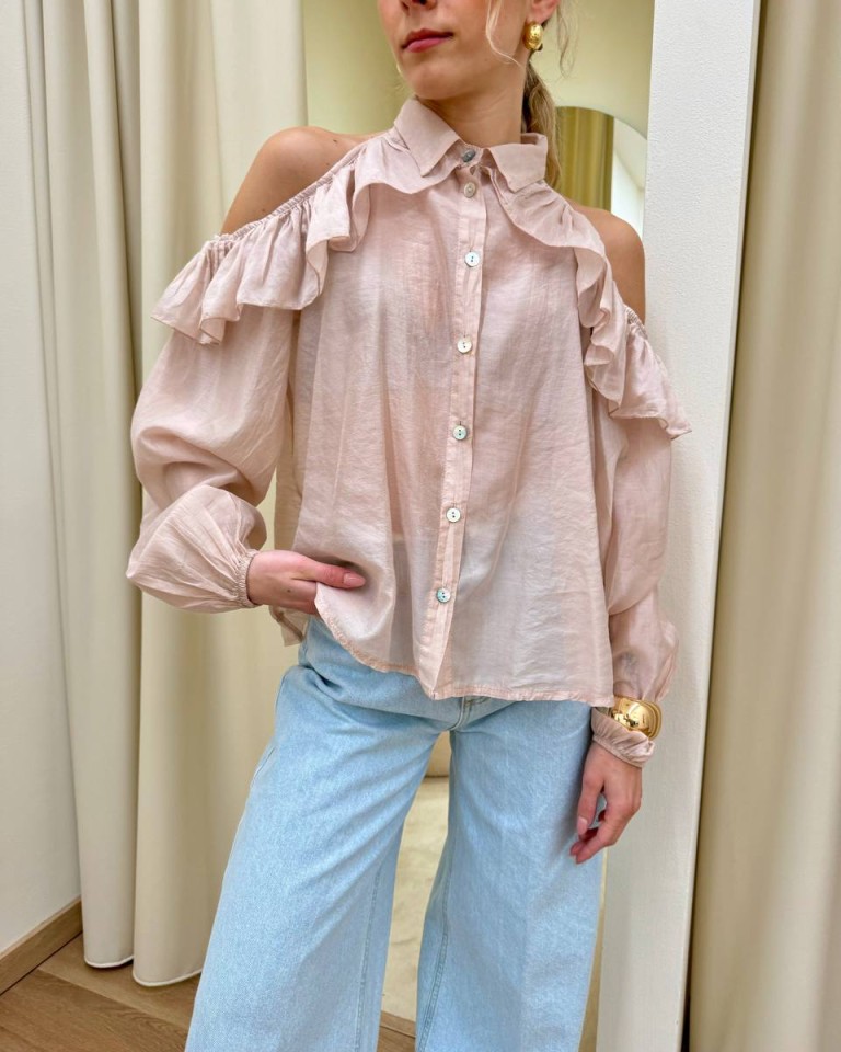 Camicia in mussola semitrasparente rosa cipria, modello over con colletto, cut out sulle spalle con rouches, maniche lunghe con elastico e arricciatura sul fondo. Vestibilità ampia.