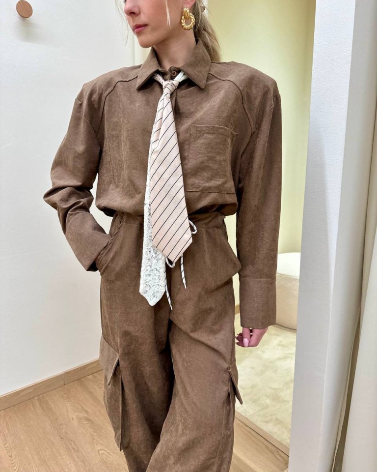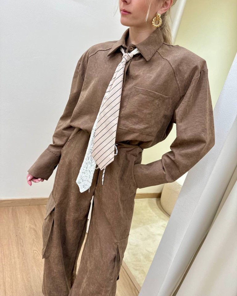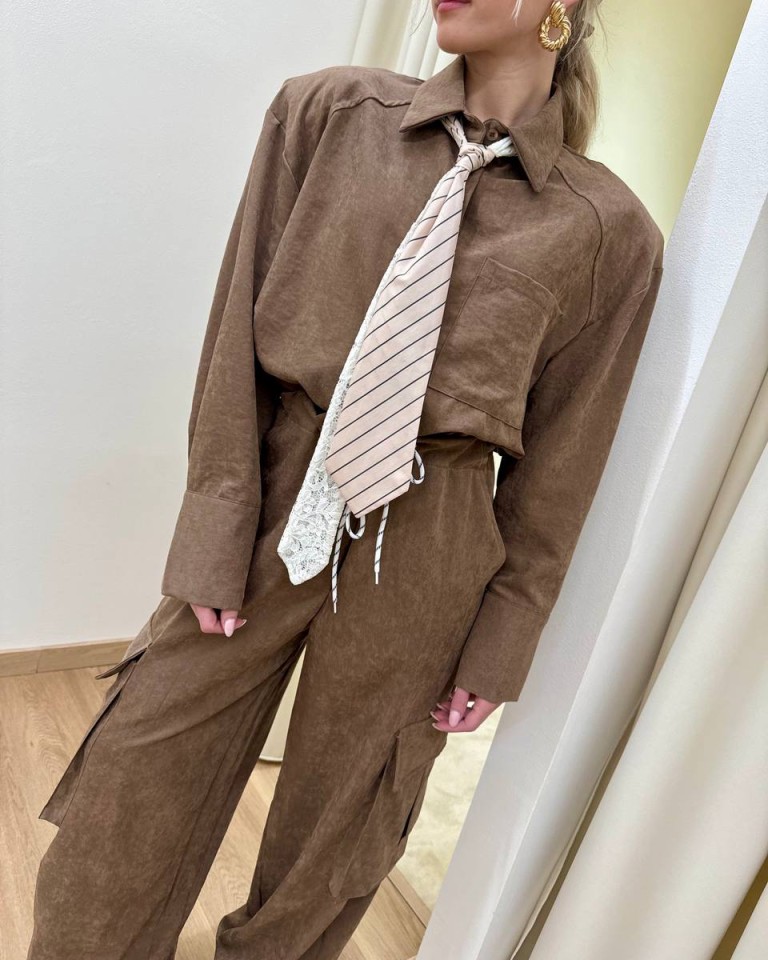 Camicia effetto camoscio color fango. Modello leggero over, maniche lunghe giro sceso e spalline imbottite, chiusura con bottoni davanti, cravatta abbinata rimovibile in tessuto a righe e in pizzo bianco. Vestibilità ampia.