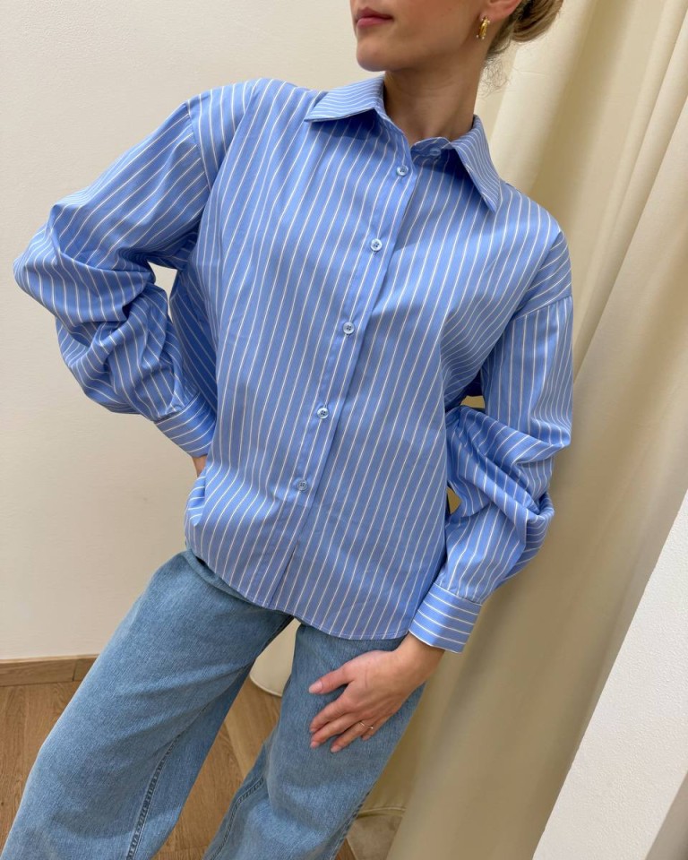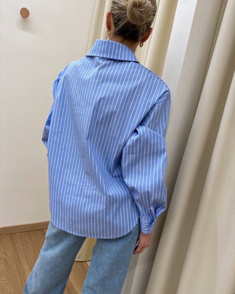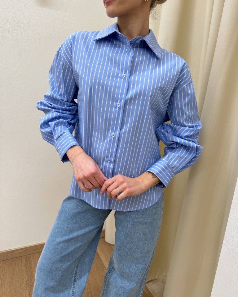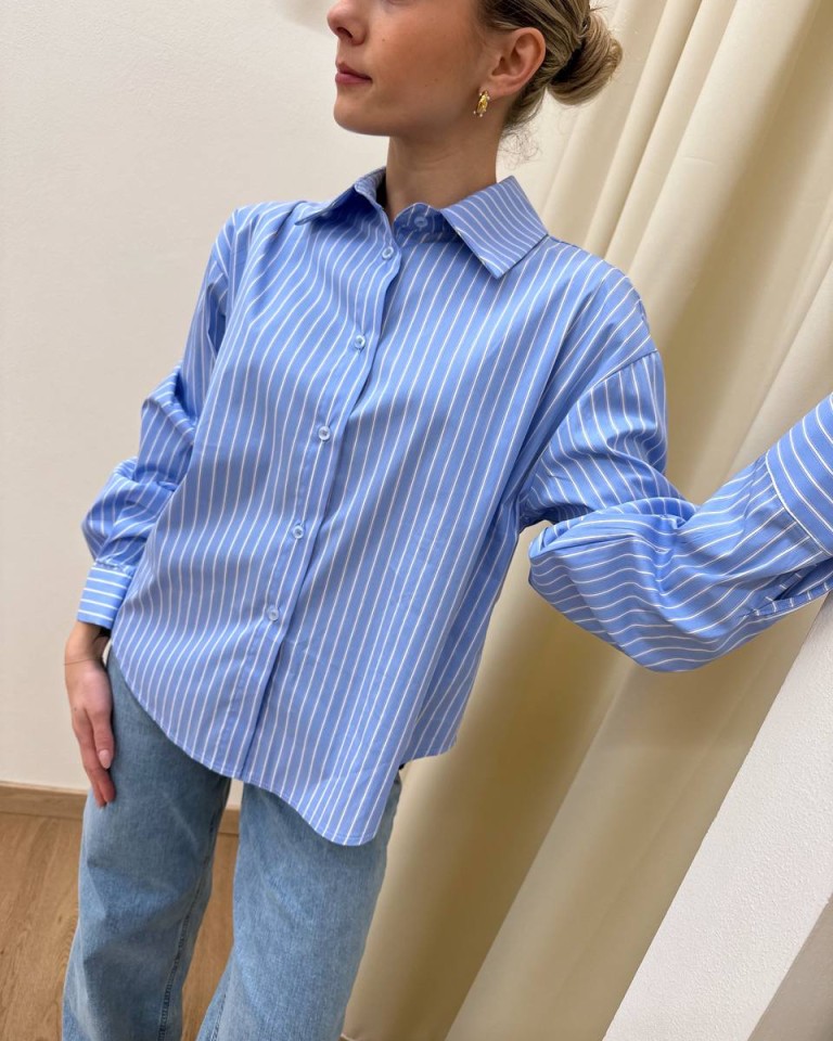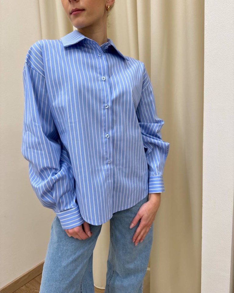 Camicia celeste a righe bianche. Modello oversize, colletto classico, manica scesa lunga e ampia con polsino, abbottonatura davanti. Vestibilità ampia.