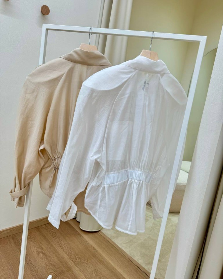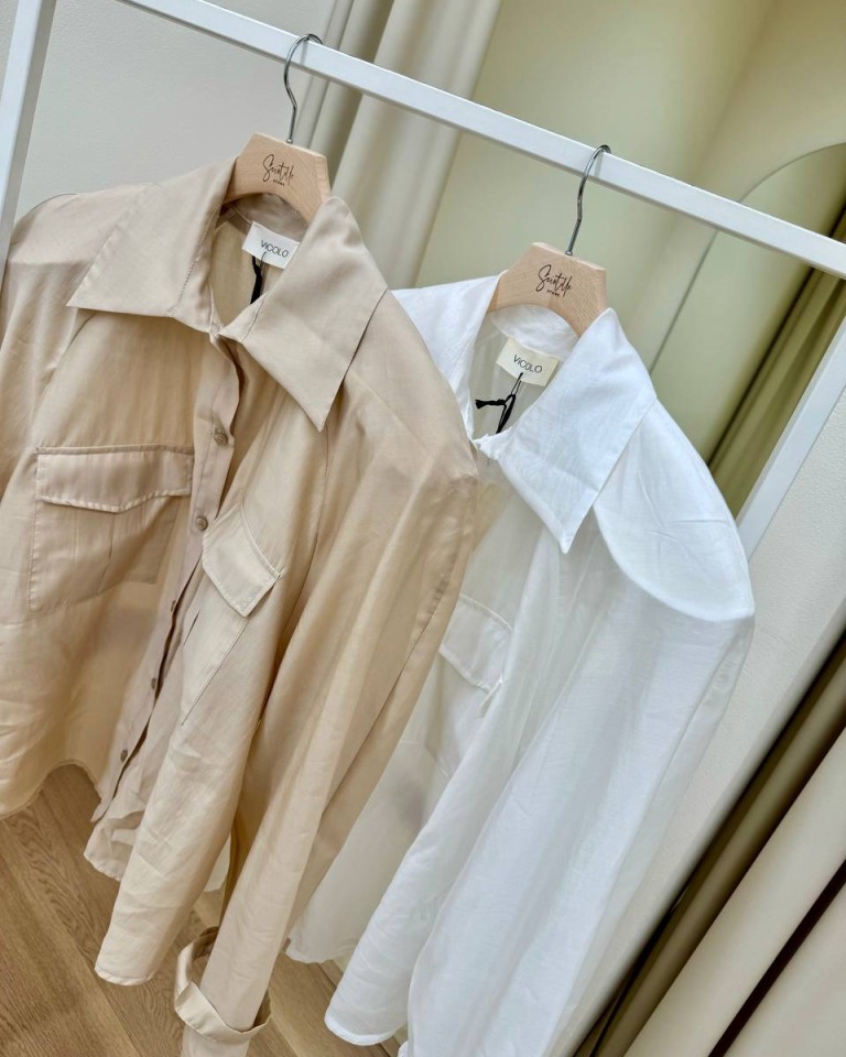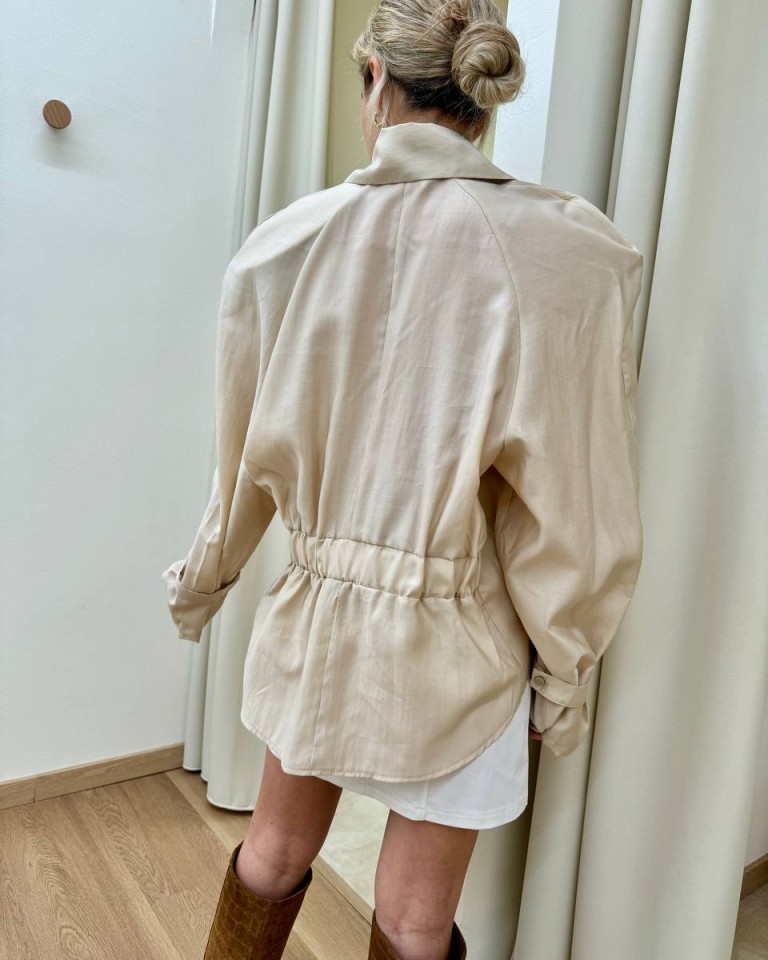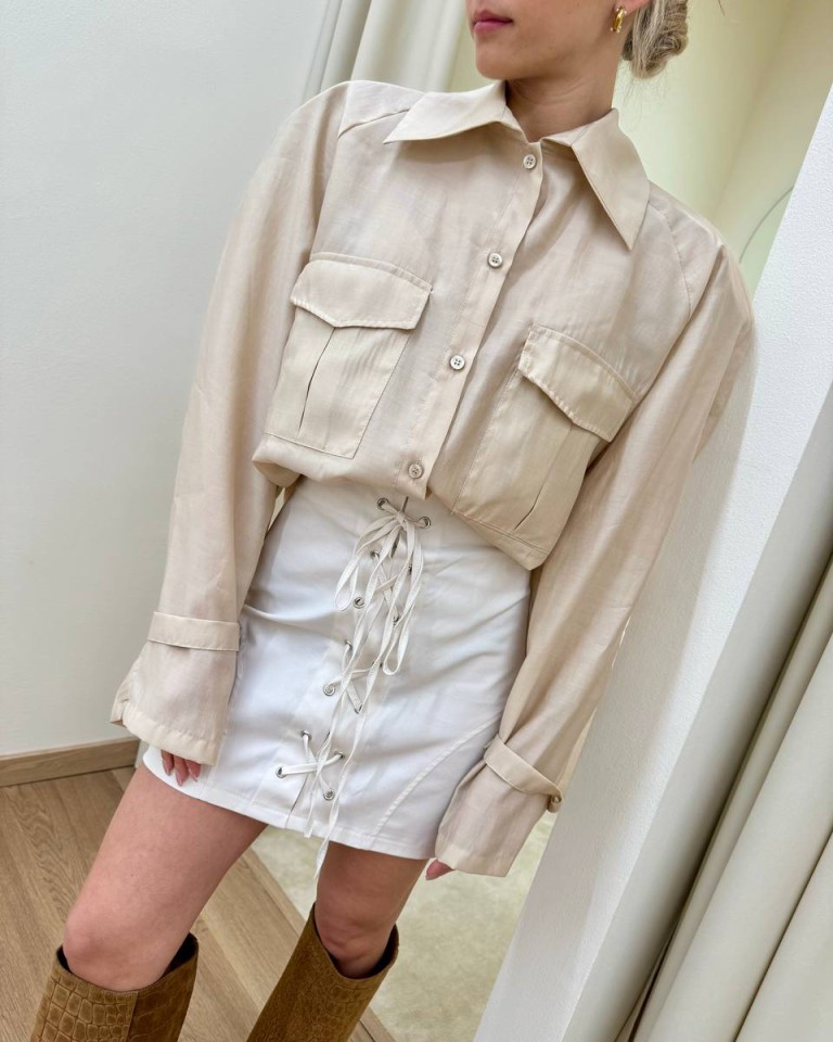 Camicia semitrasparente color beige, modello over con maniche lunghe raglan e lacci su polsi, maxi spalline imbottite, maxi tasche sul davanti, elastico in vita sul dietro. Vestibilità ampia.