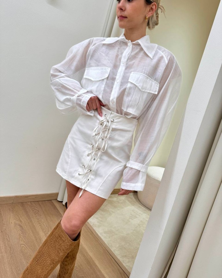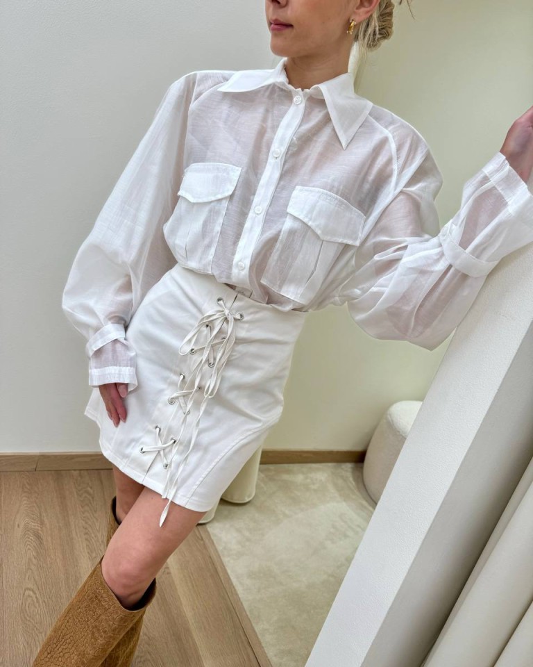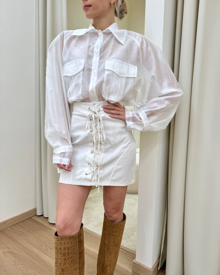 Camicia semitrasparente bianca, modello over con maniche lunghe raglan e lacci su polsi, maxi spalline imbottite, maxi tasche sul davanti, elastico in vita sul dietro. Vestibilità ampia.