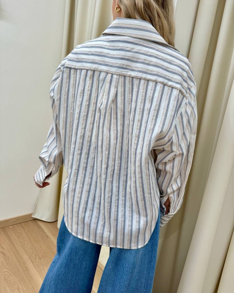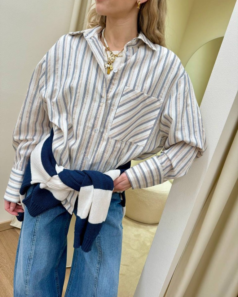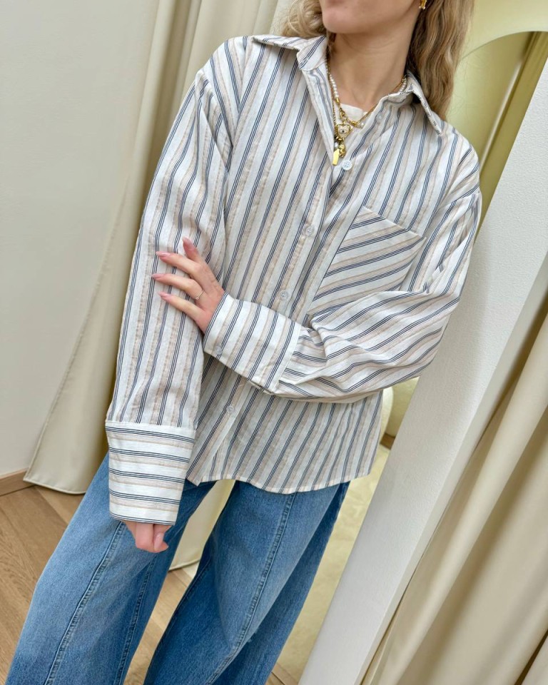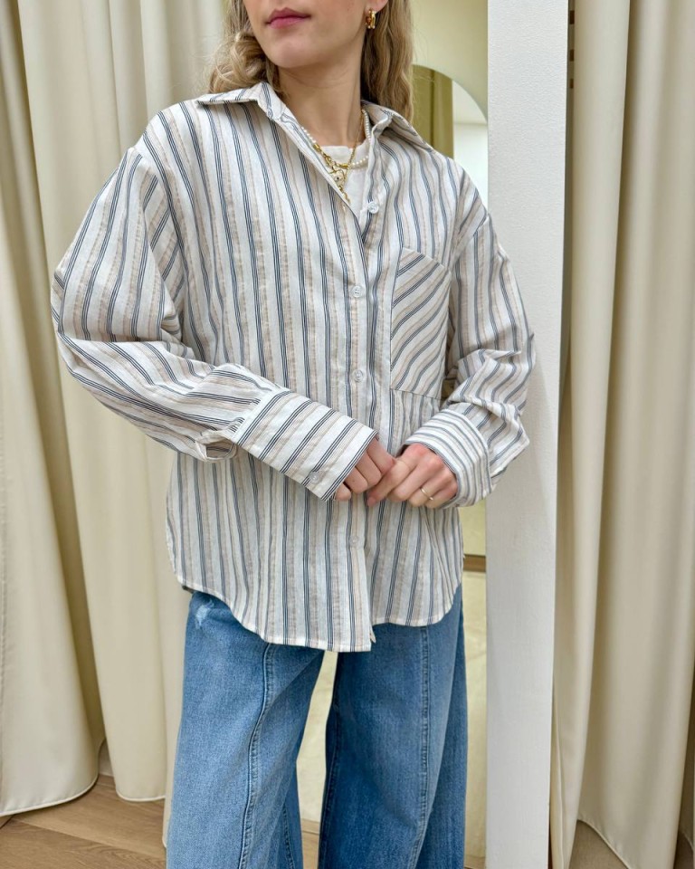 Camicia a righe panna, blu e nocciola, modello over, a scatoletta con spacchetti sui fianchi, maniche lunghe e giro sceso, colletto classico, tasca quadrata e abbottonatura davanti. Vestibilità ampia.