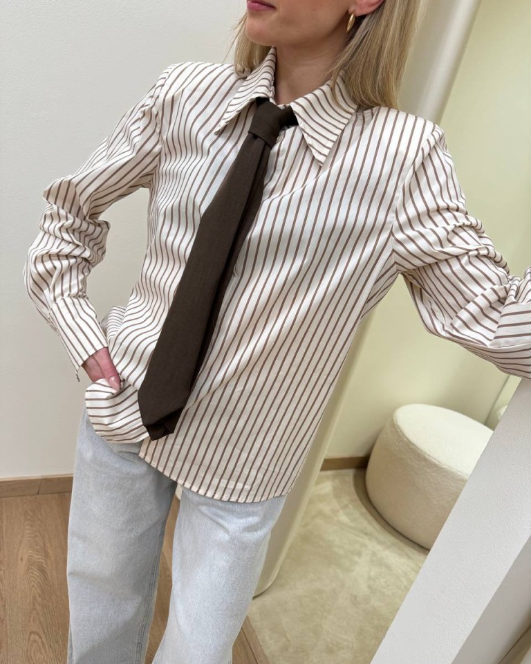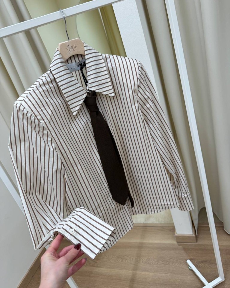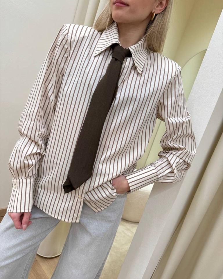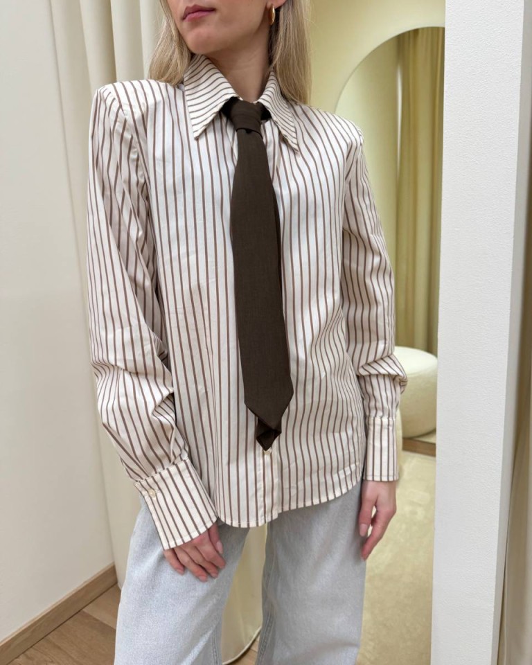 Camicia a righe burro e nocciola con cravatta moro abbinata rimovibile. Modello classico con maniche lunghe e spalline imbottite. Vestibilità regolare.