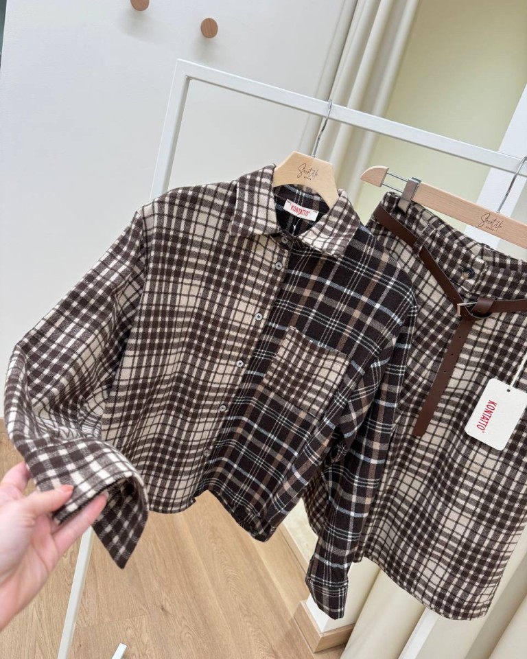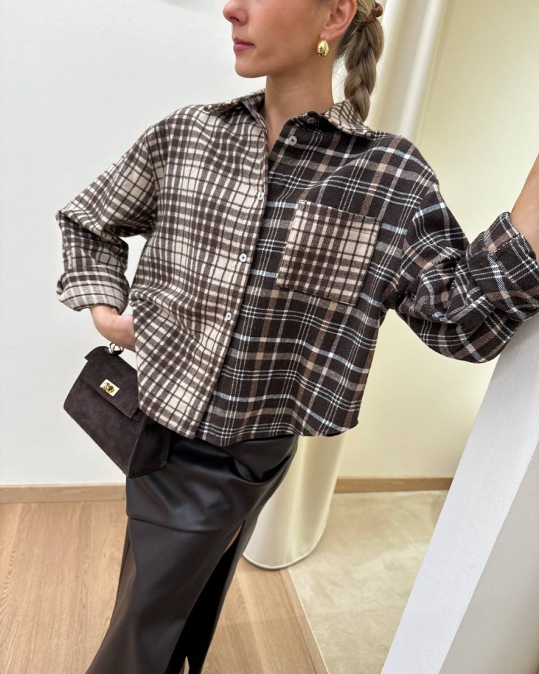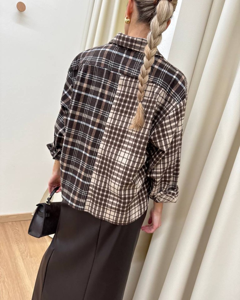 Camicia check bicolore sui toni del marrone in flanella di cotone, modello scatoletta ampio, maniche lunghe, colletto e chiusura frontale con bottoni. Tasca laterale applicata. Vestibilità morbida.