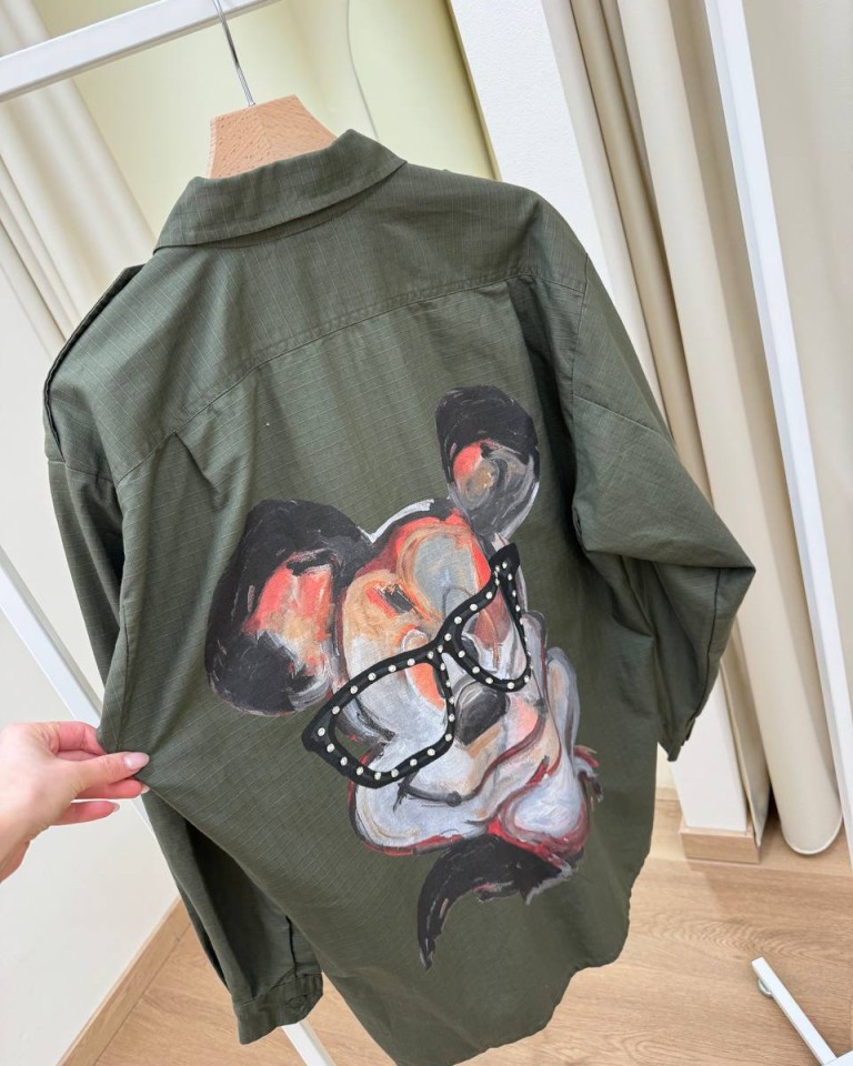 Camicia vintage verde militare con stampa Mickey Mouse sul dietro e cabochon, modello over, manica lunga scesa, alamari sulle spalle, abbottonatura davanti nascosta. Tasche a toppa con patta sul davanti. Vestibilità ampia.