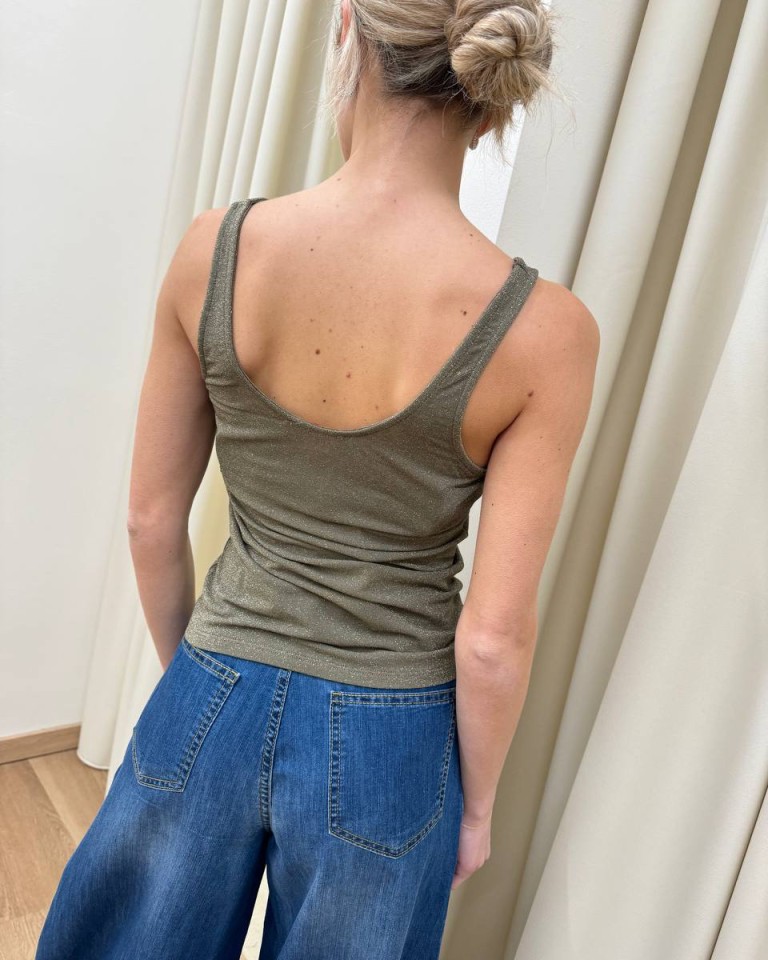 Canotta in maglia color verde militare con lurex oro, modello classico, scollo ovale con spalline larghe. Vestibilità aderente ed elasticizzata.