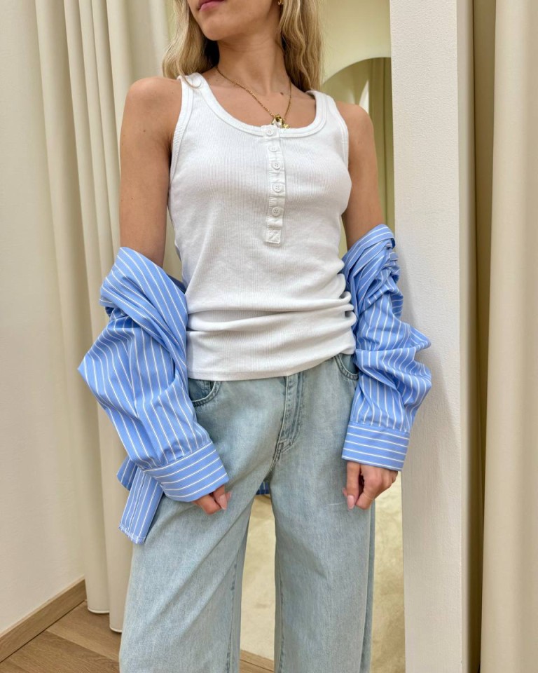 Canotta in maglia a costine bianca, modello scollo stondato, spalline lerghe, apertura con cinque bottoni sullo scollo. Vestibilità aderente ed elasticizzata.