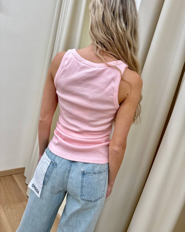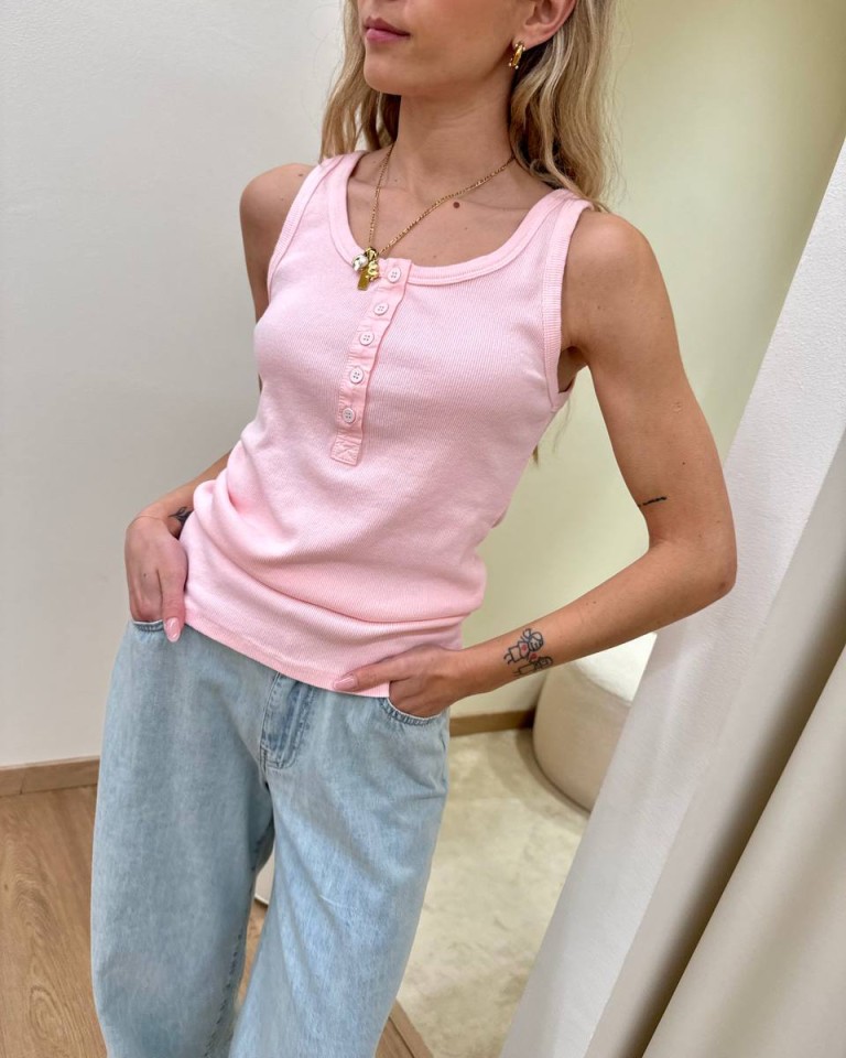 Canotta in maglia a costine rosa, modello scollo stondato, spalline lerghe, apertura con cinque bottoni sullo scollo. Vestibilità aderente ed elasticizzata.