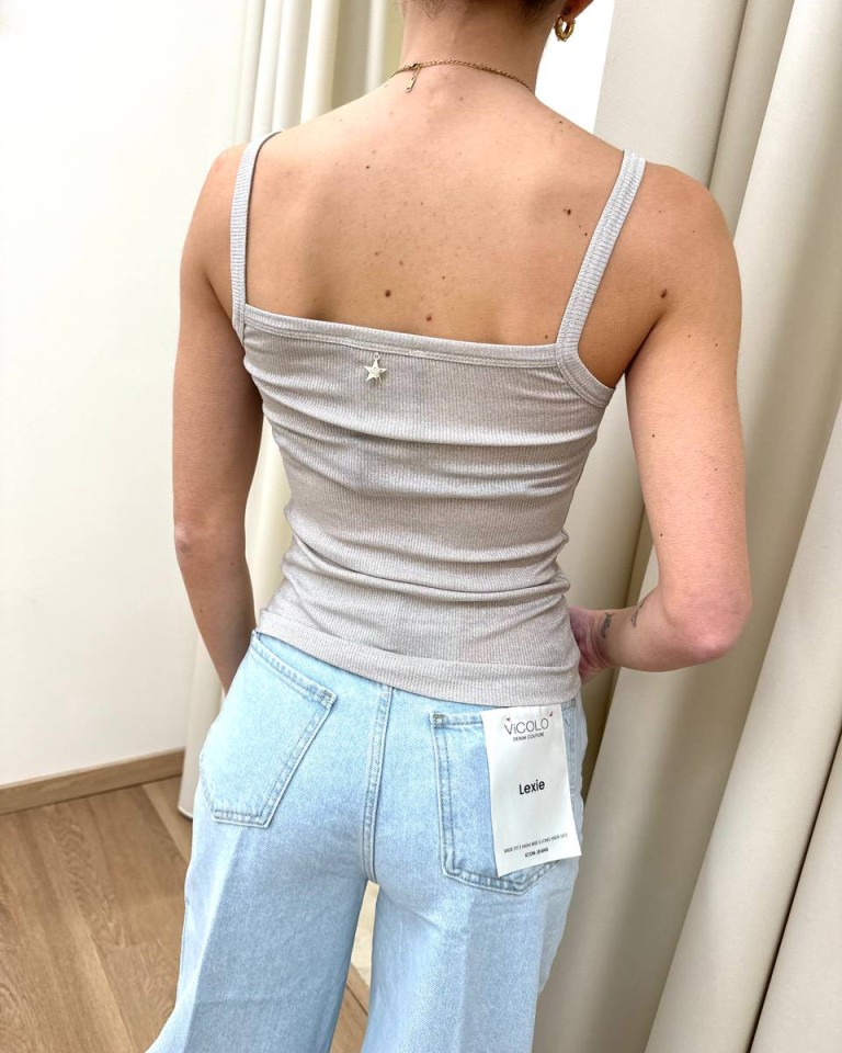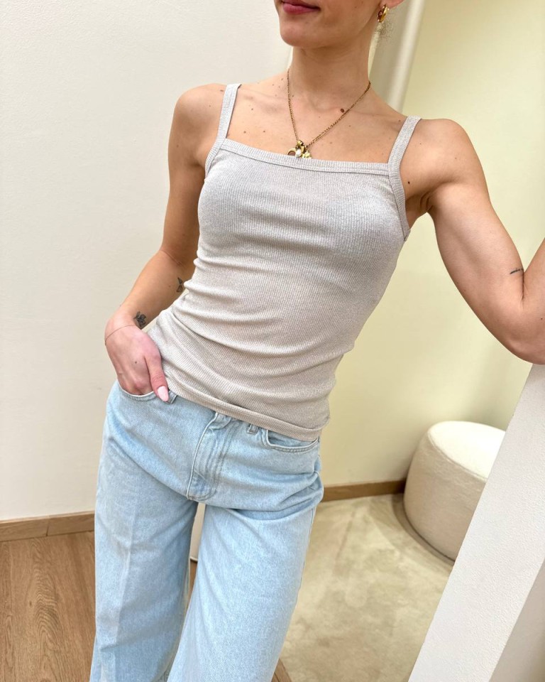 Canotta in maglia a costine grigio perla con lurex argento, modello dritto con scollo a fascia e spalline sottili. Vestibilità aderente elasticizzata.