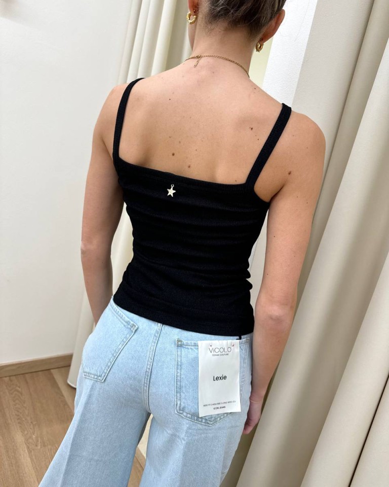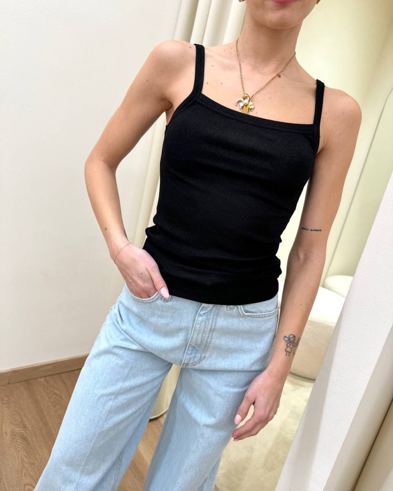 Canotta in maglia a costine nera con lurex in tono, modello dritto con scollo a fascia e spalline sottili. Vestibilità aderente elasticizzata.