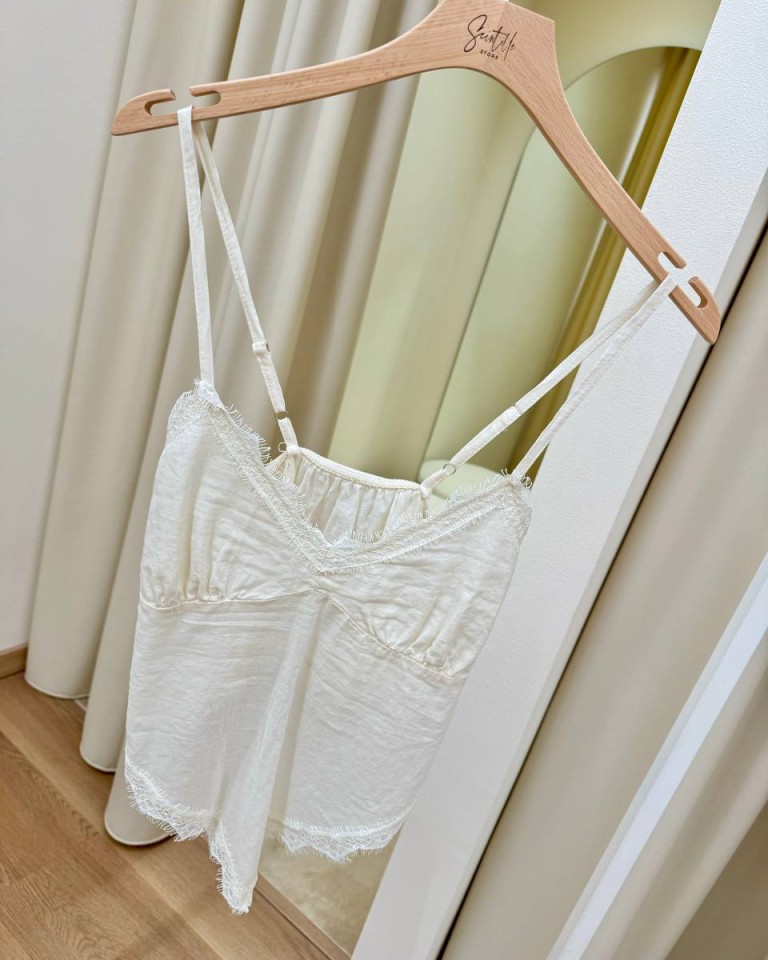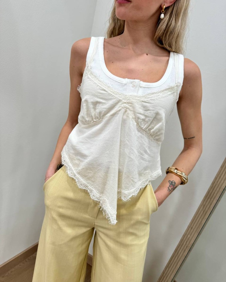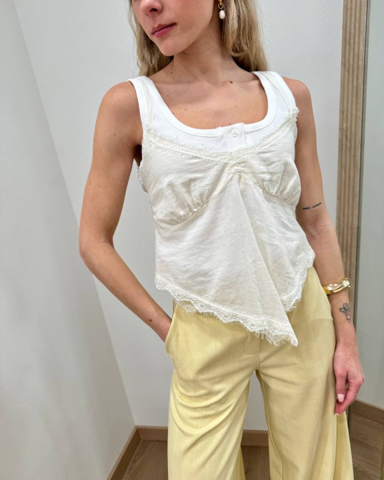 Canotta color panna composta da due modelli separabili, una canotta basica in maglia a costine con scollo stondato e bottoncini + una canotta con scollo a V e fondo a punta con merletto in pizzo, spalline sottili regolabili. Vestibilità regolare.