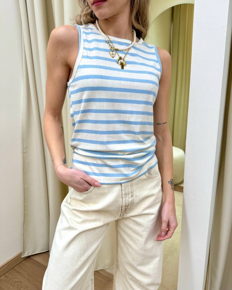 Canotta in maglia a costine rigata panna e celeste, modello basic dritto, girocollo e spalline larghe. Vestibilità regolare.