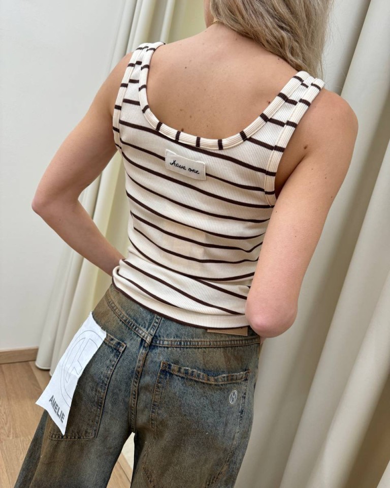 Canotta in maglia a costine a righe burro e moro, modello scollo stondato, spalline lerghe, apertura con tre bottoni sullo scollo, patch con logo sul dietro. Vestibilità aderente ed elasticizzata.