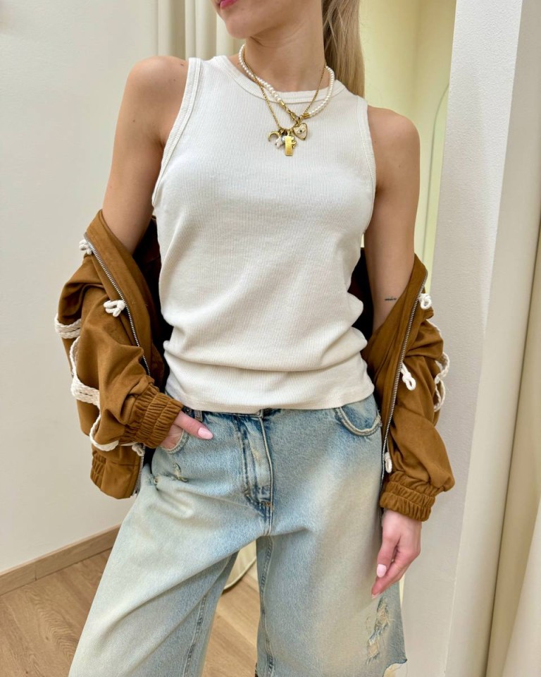 Canotta a costine color avorio. Modello scollo all’americana, spalline larghe. Vestibilità aderente elasticizzata.