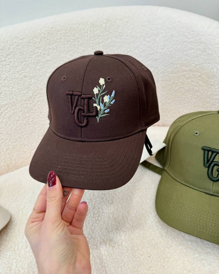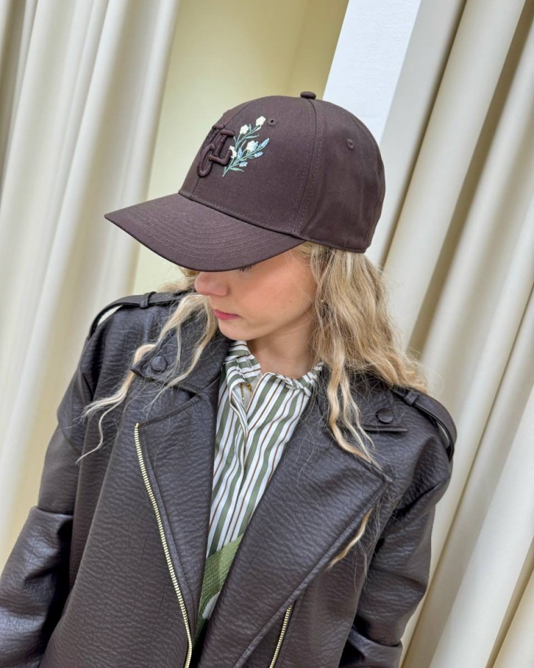 Cappello con visiera in cotone color moro con ricamo floreale e logo Vicolo.
