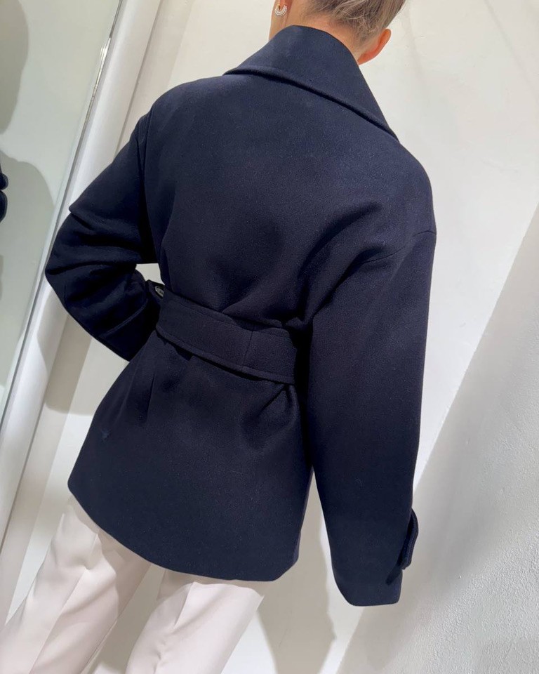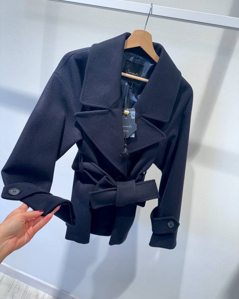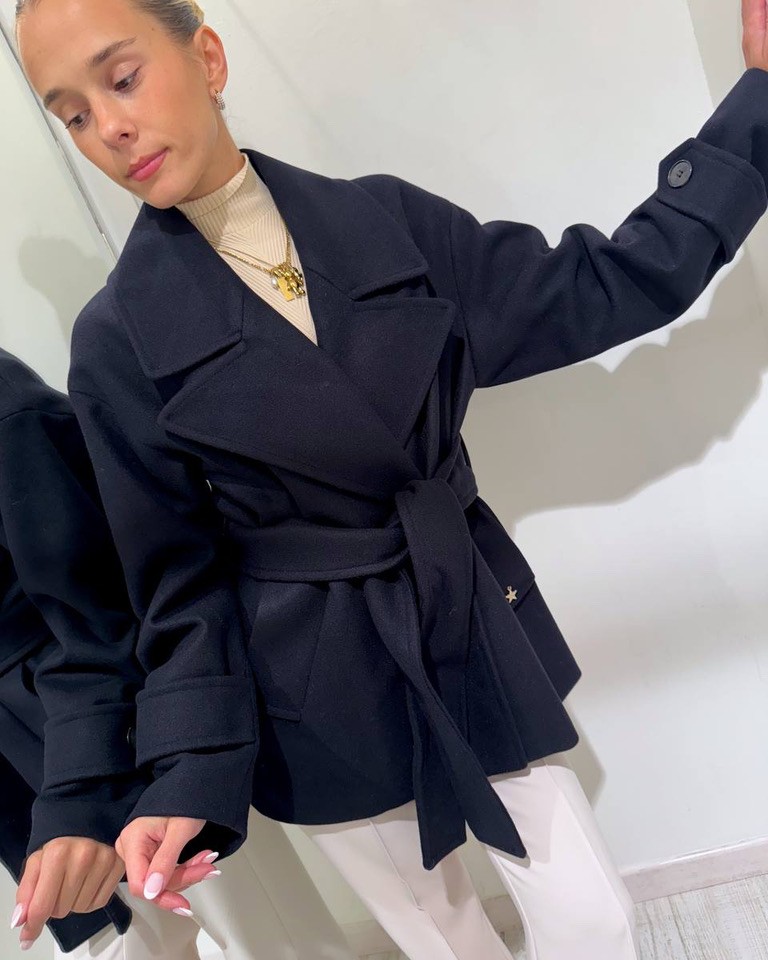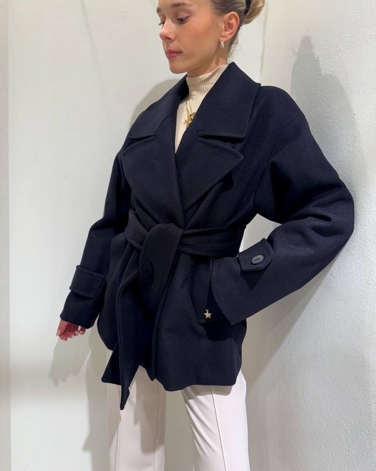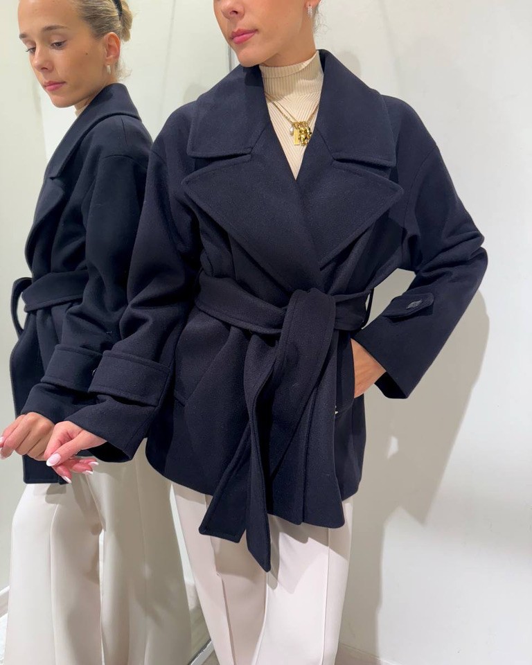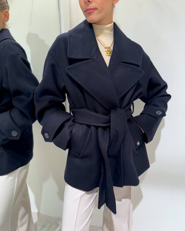 Cappotto blu foderato all’interno, modello corto, maxi collo a revers e maniche lunghe scese con mostrina su polsi. Chiusura frontale doppiopetto con bottoni e cintura. Tasche laterali. Vestibilità regolare.