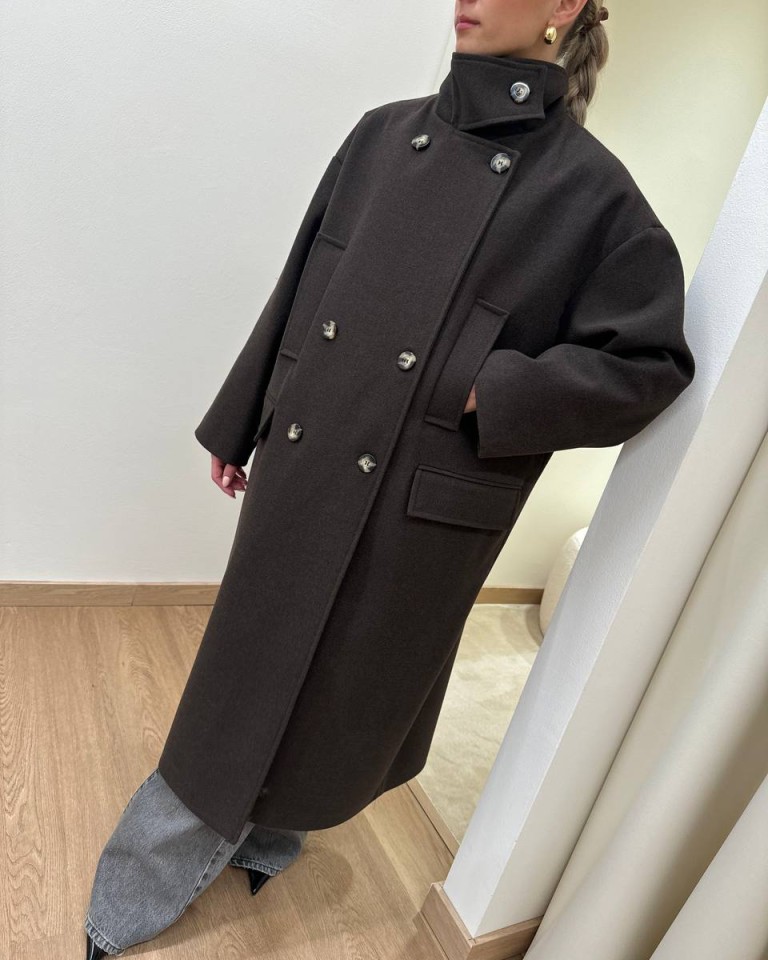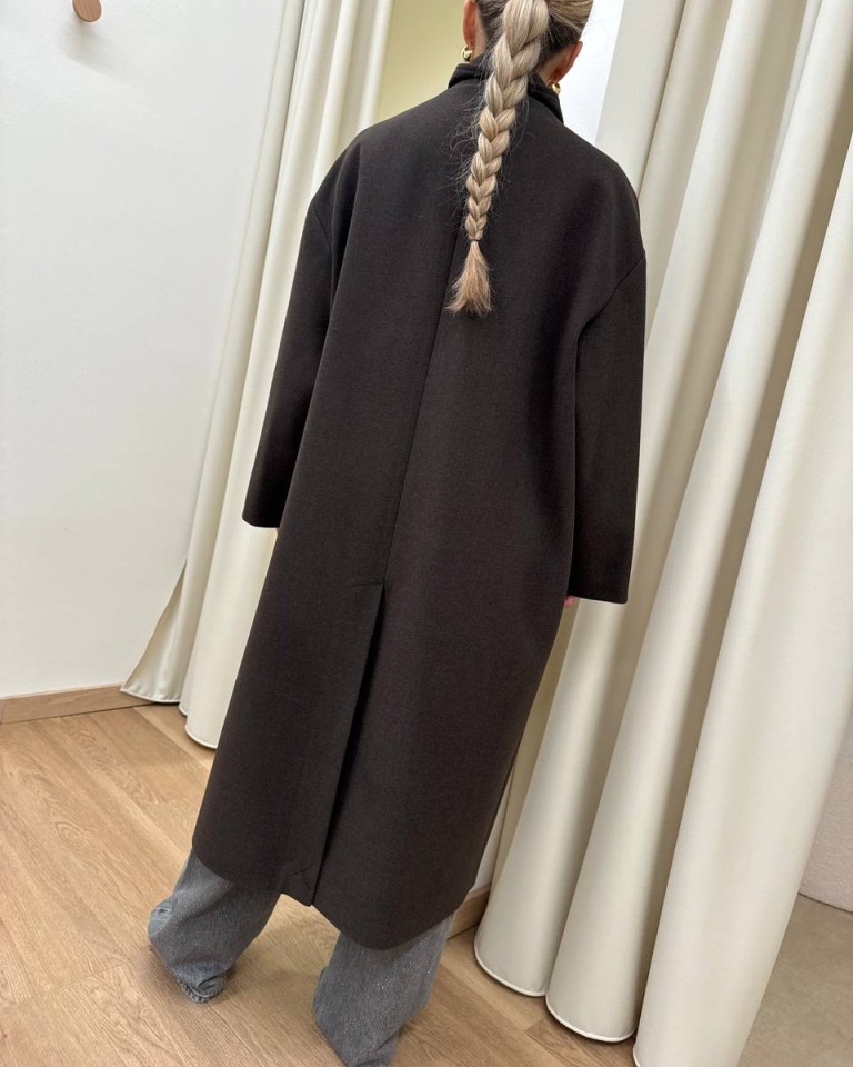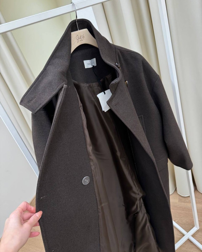 Cappotto moro con viscosa e lana, modello lungo ad ovetto con fodera interna, maniche lunghe scese, chiusura frontale doppiopetto quattro tasche laterali a filo e con patta. Collo rever da poter alzare e chiudere. Spacco sul dietro. Vestibilità morbida.