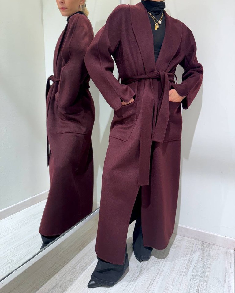 Cappotto bordeaux Hand Made in misto lana, modello lungo con collo revers, chiusura frontale con cintura e tasche laterali applicate. Non foderato con vestibilità dritta.
