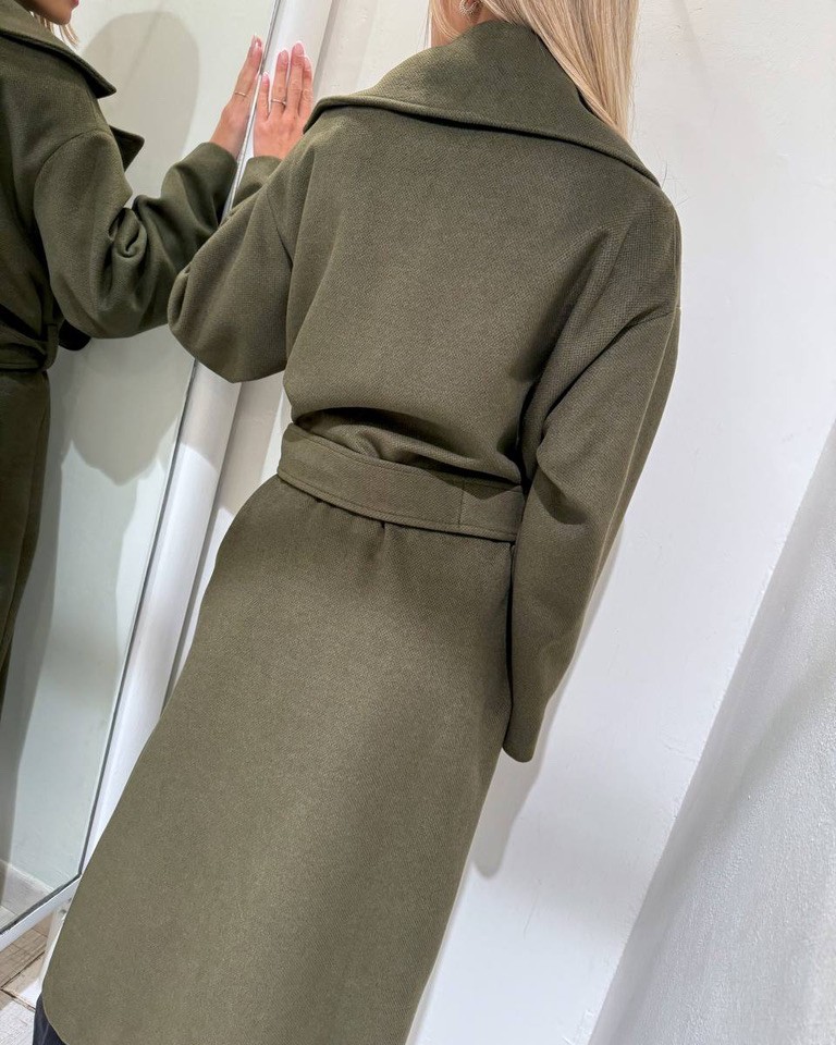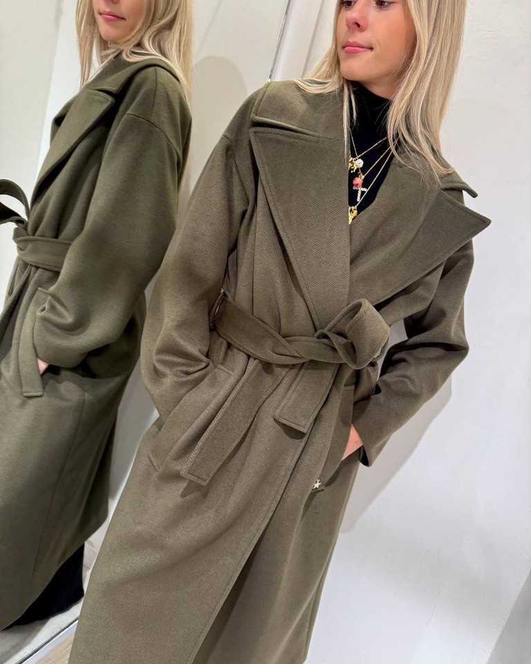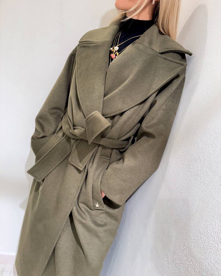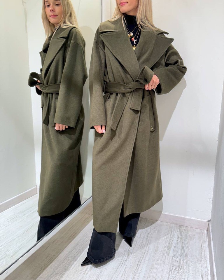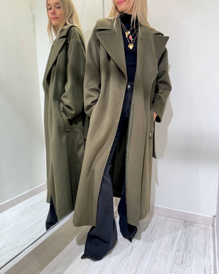 Cappotto verde militare foderato all’interno, modello ampio, maniche lunghe scese con maxi collo a revers, chiusura frontale con cintura e tasche laterali a filetto. Vestibilità ampia.