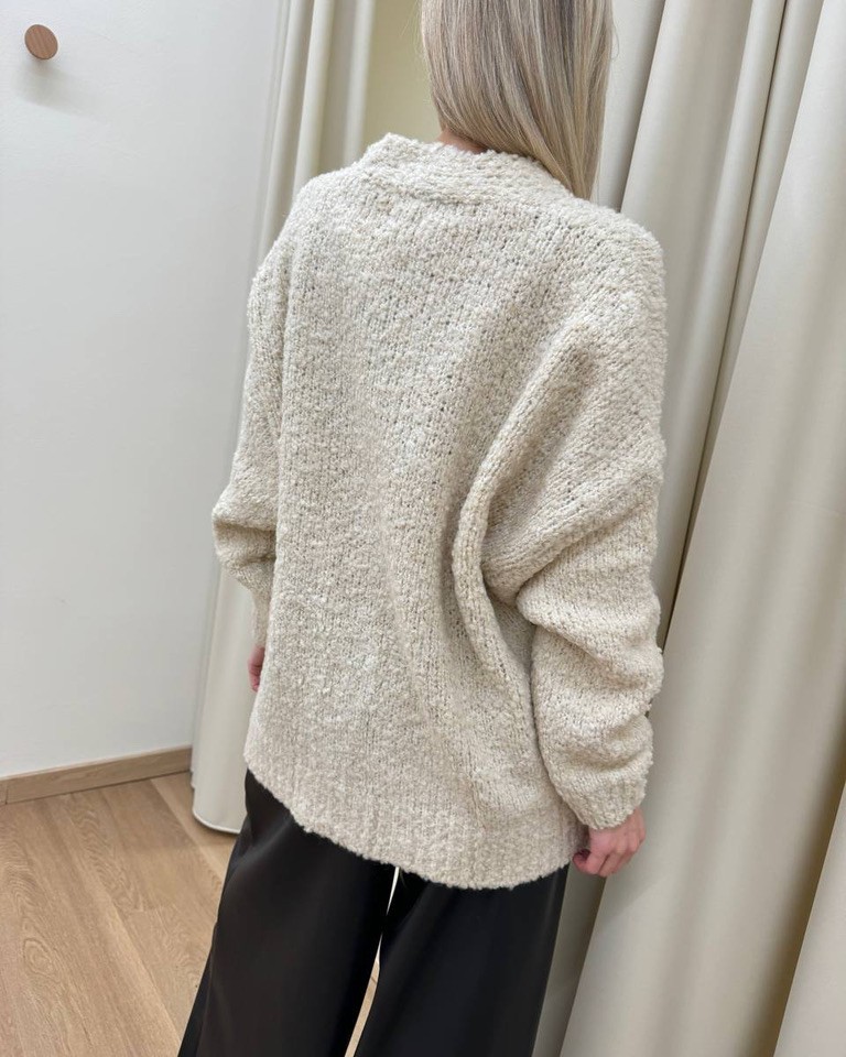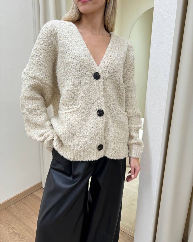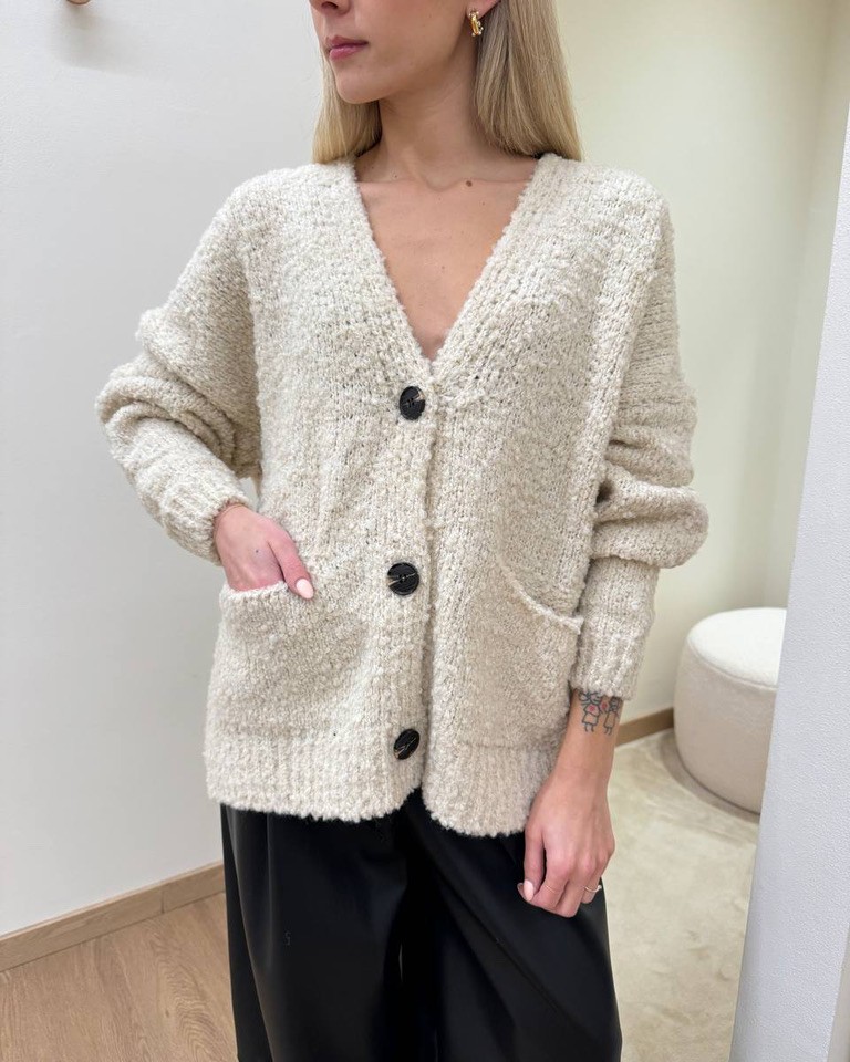 Cardigan color crema in maglia bouclè con viscosa, lana e alpaca, modello oversize con maniche lunghe scese, scollo a V, tasche applicate laterali e chiusura frontale con bottoni. Vestibilità morbida e ampia.