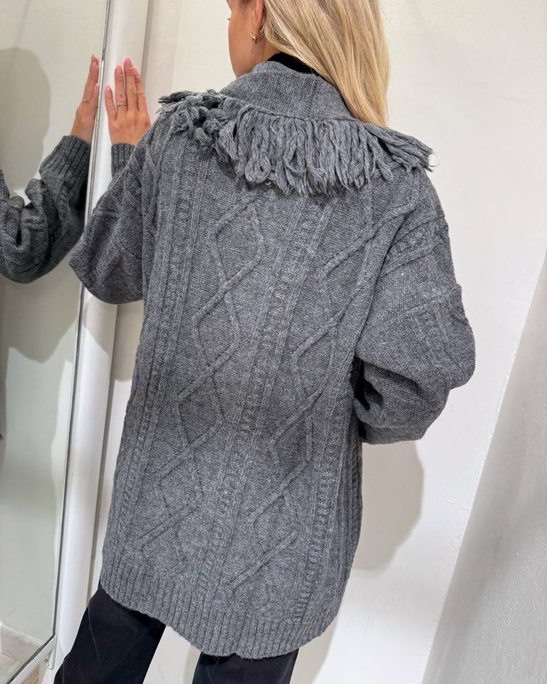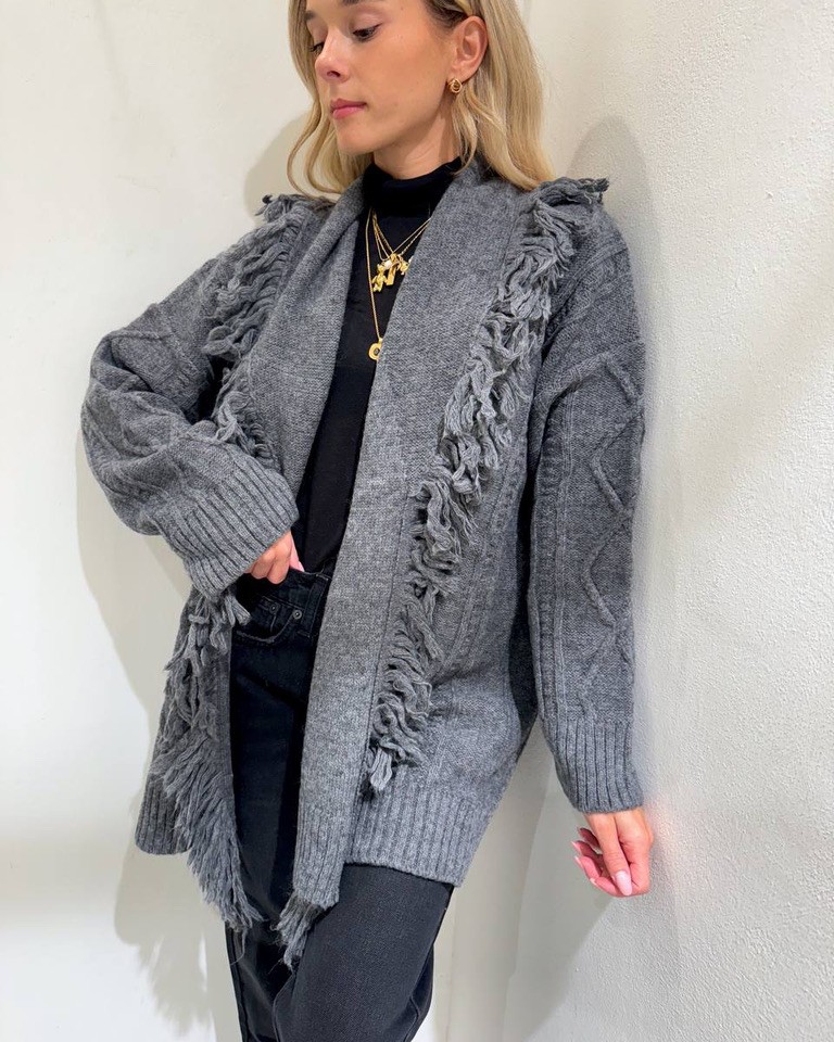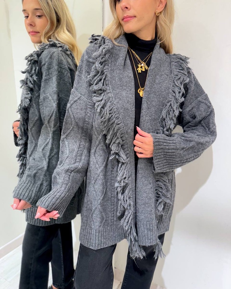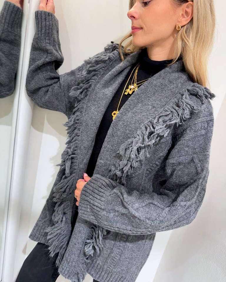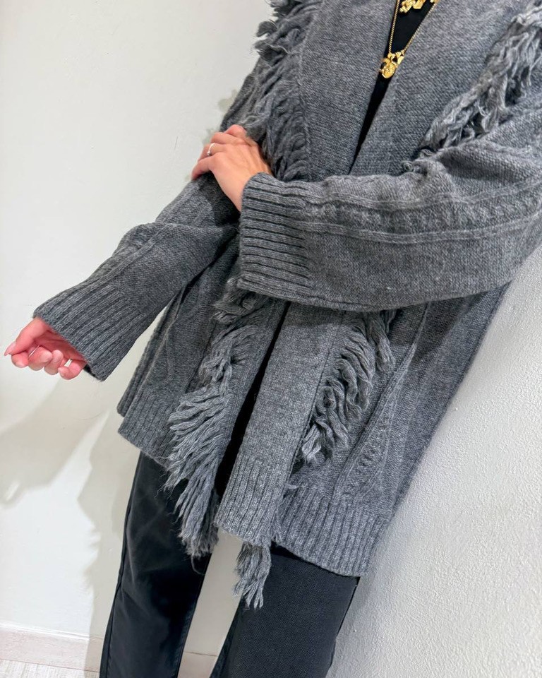 Cardigan color grigio in viscosa, lana e alpaca con trecce, modello dritto, maniche lunghe scese, collo sciallato con frange in tono. Non ha chiusure. Vestibilità regolare.