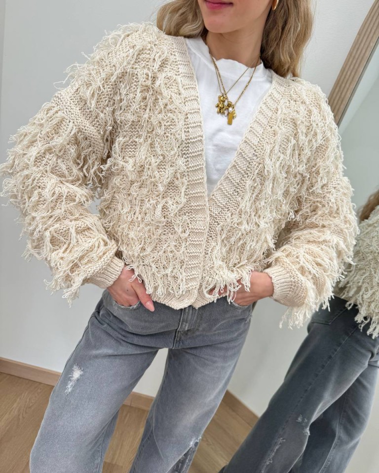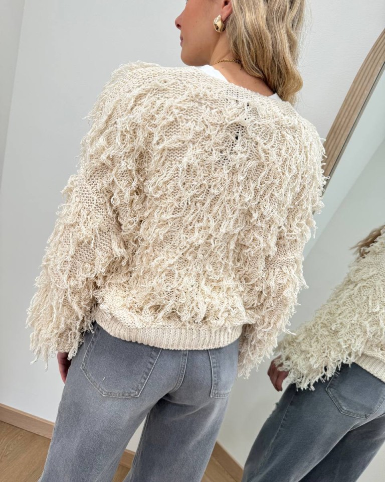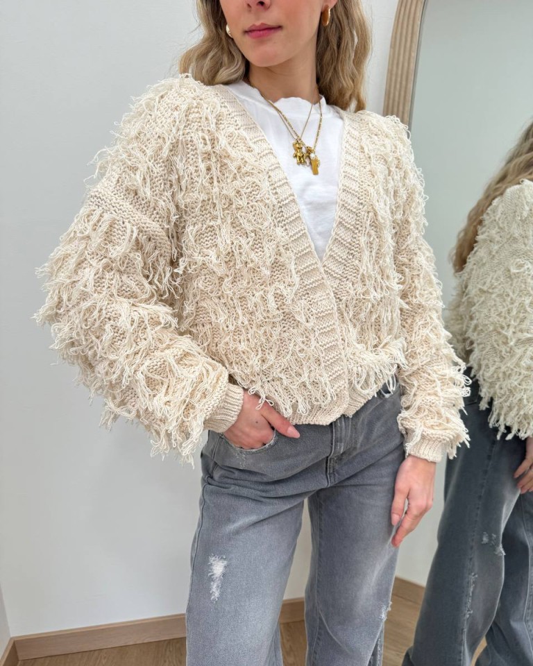Cardigan in maglia color avorio con sfrangiature, modello over, corto con scollo a v, manica lunga e giro sceso con polsino e orlo a coste, chiusura davanti con due bottoni automatici nascosti. Vestibilità ampia.