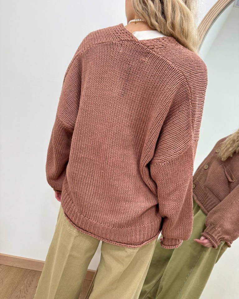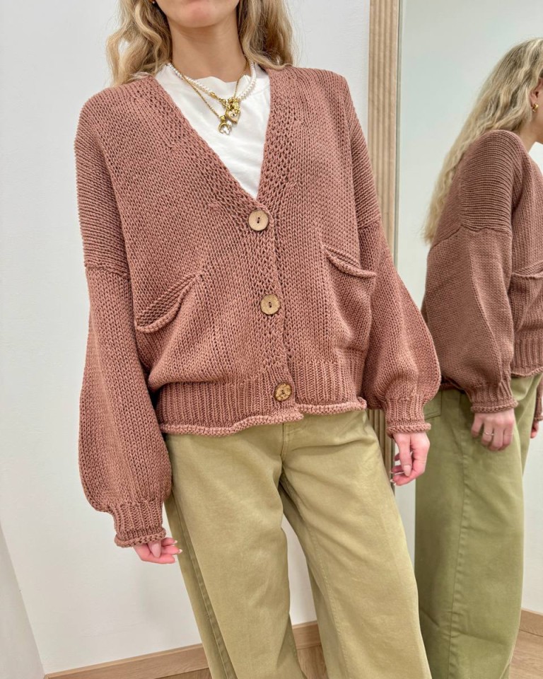 Cardigan in maglia phard, modello oversize con maniche lunghe scese a palloncino. Scollo a V, tasche applicate laterali e chiusura frontale con bottoni in legno. Vestibilità morbida e ampia.