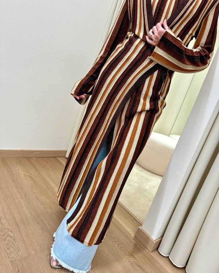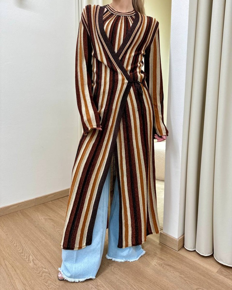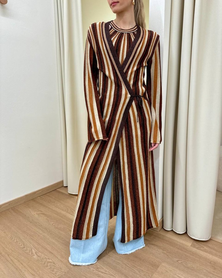 Cardigan in maglia e lurex a righe moro, cioccolato, beige e ruggine. Modello dritto, lungo, maniche lunghe e chiusura davanti con nastri. Vestibilità dritta regolare.