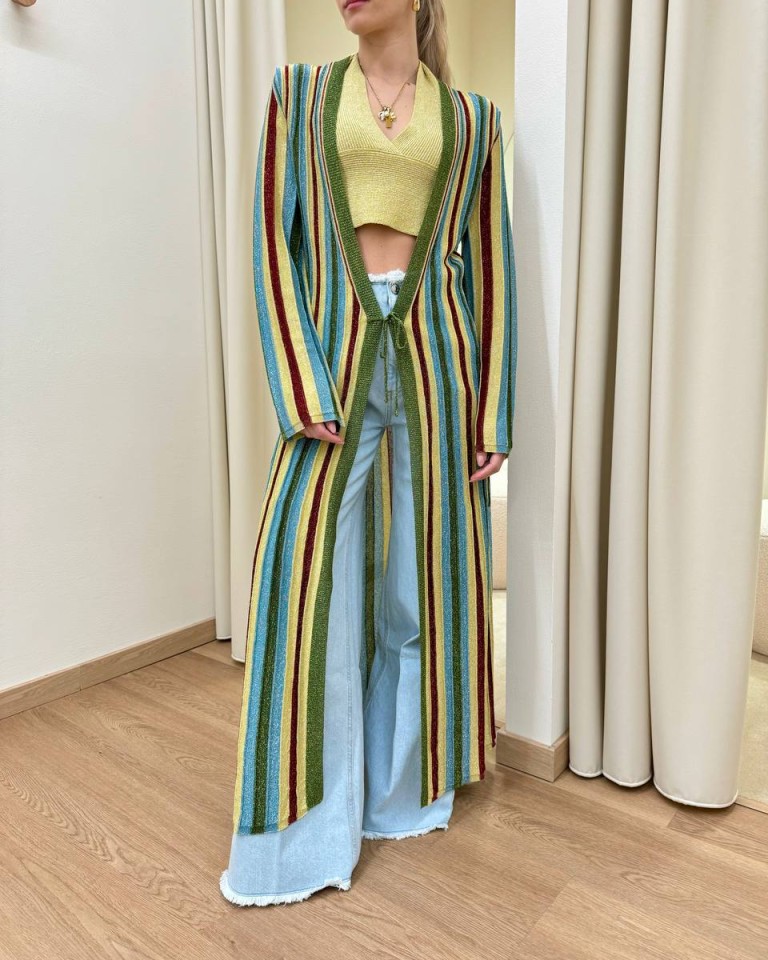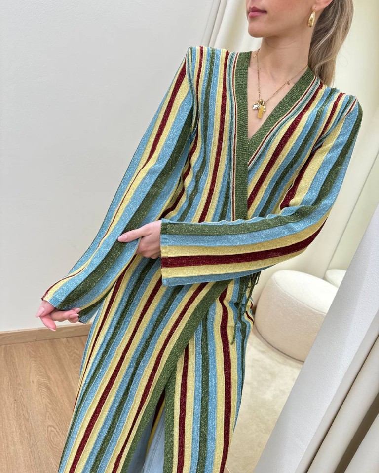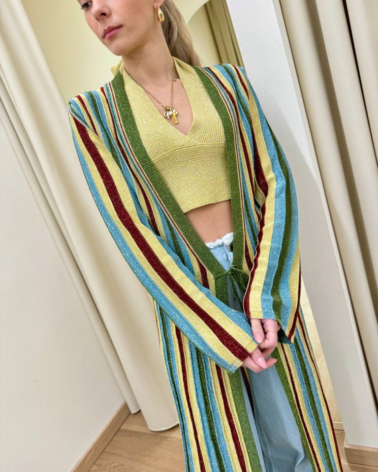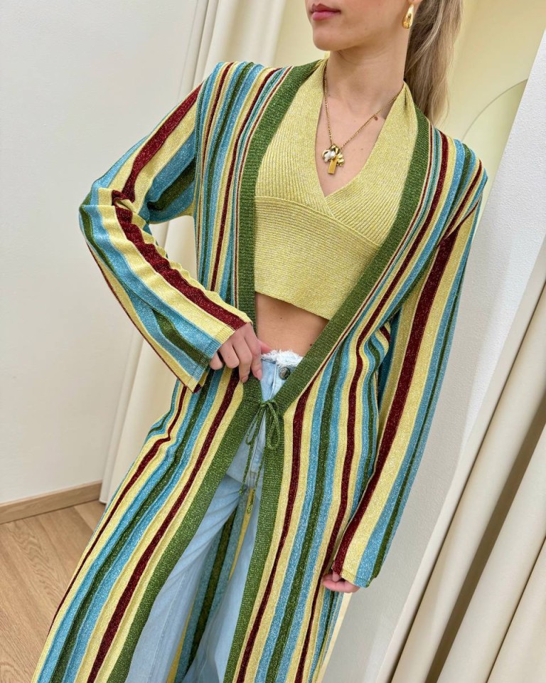 Cardigan in maglia e lurex a righe verde, menta, giallo e ruggine. Modello dritto, lungo, maniche lunghe e chiusura davanti con nastri. Vestibilità dritta regolare.