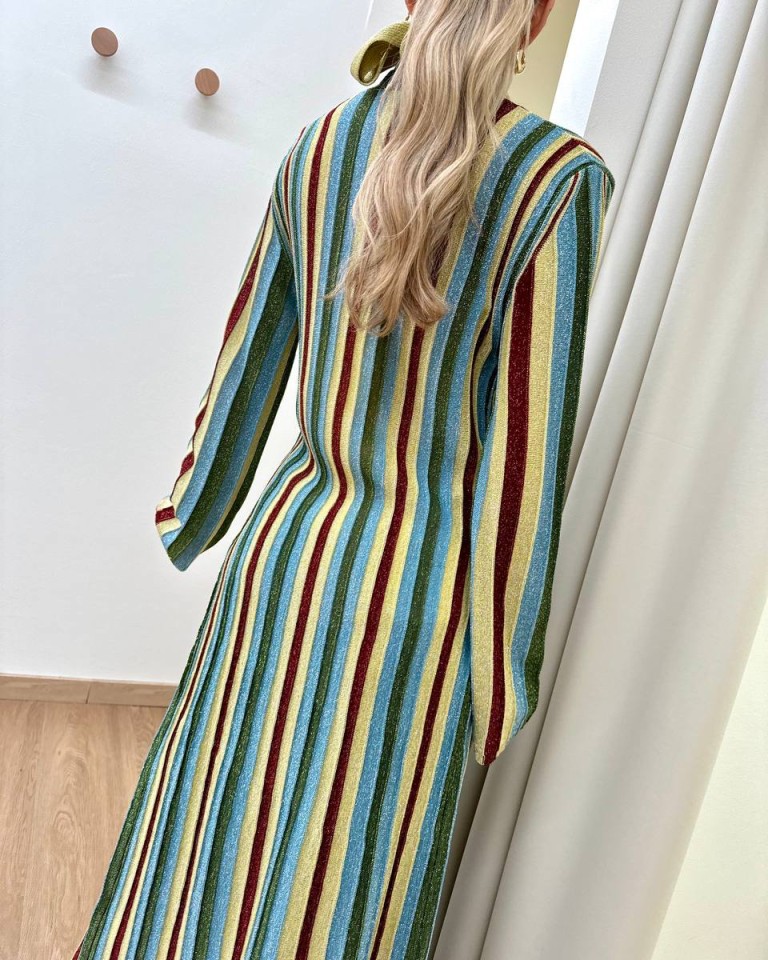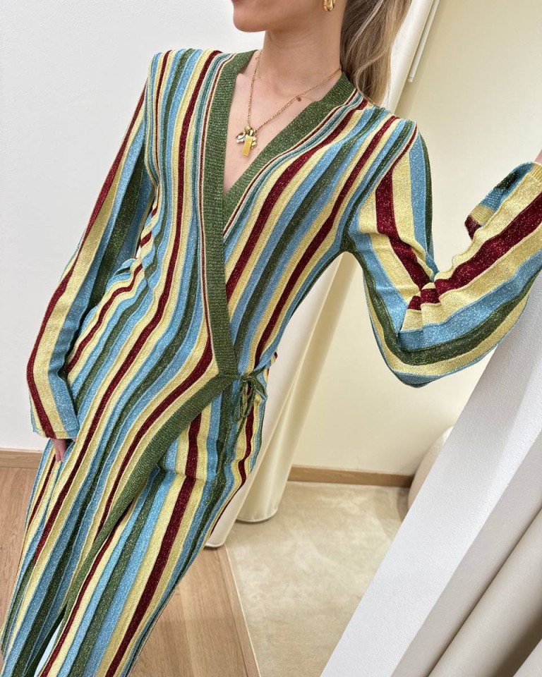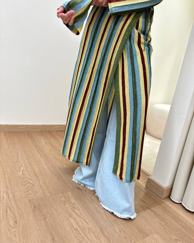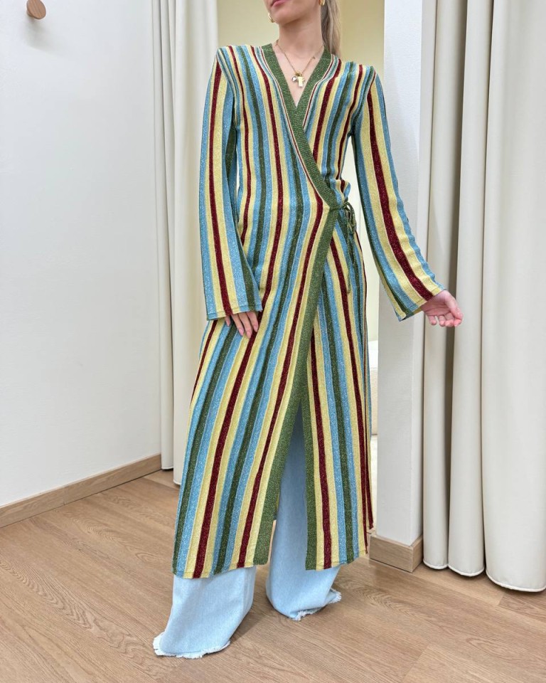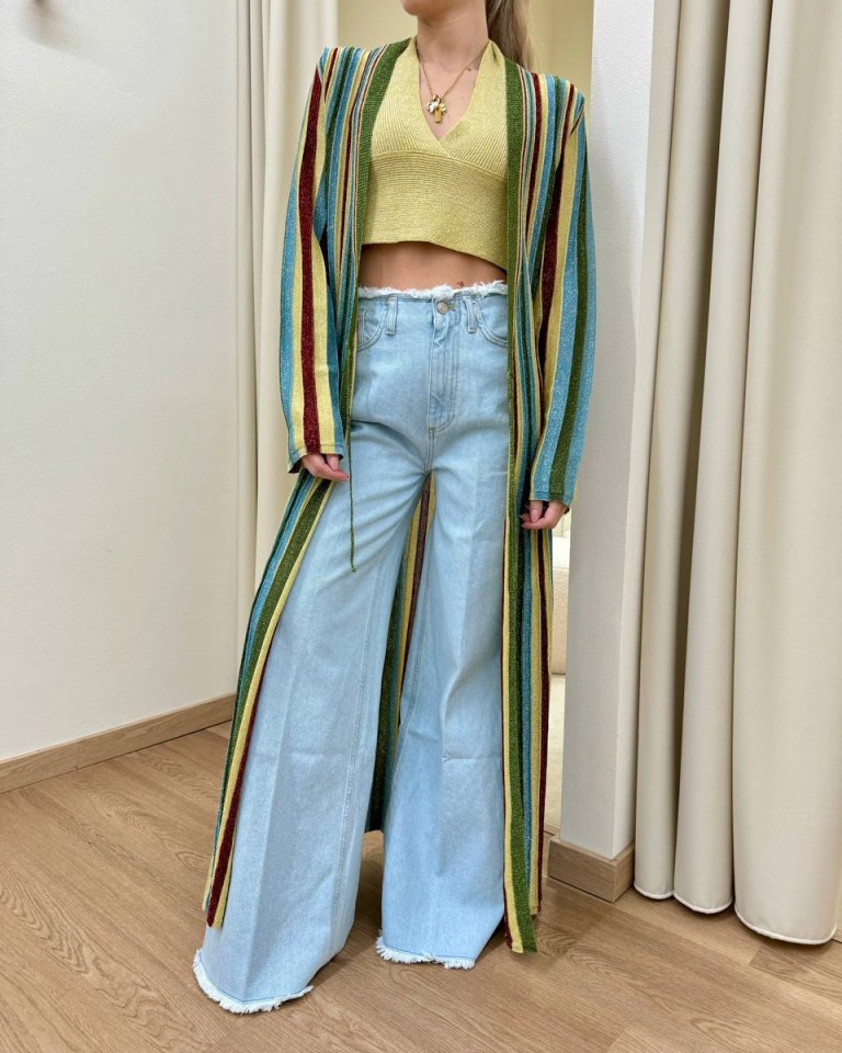 Cardigan in maglia e lurex a righe verde, menta, giallo e ruggine. Modello dritto, lungo, maniche lunghe e chiusura davanti con nastri. Vestibilità dritta regolare.