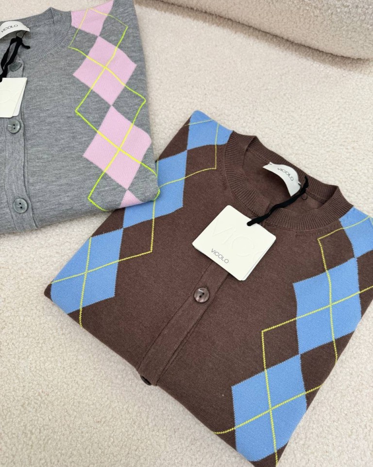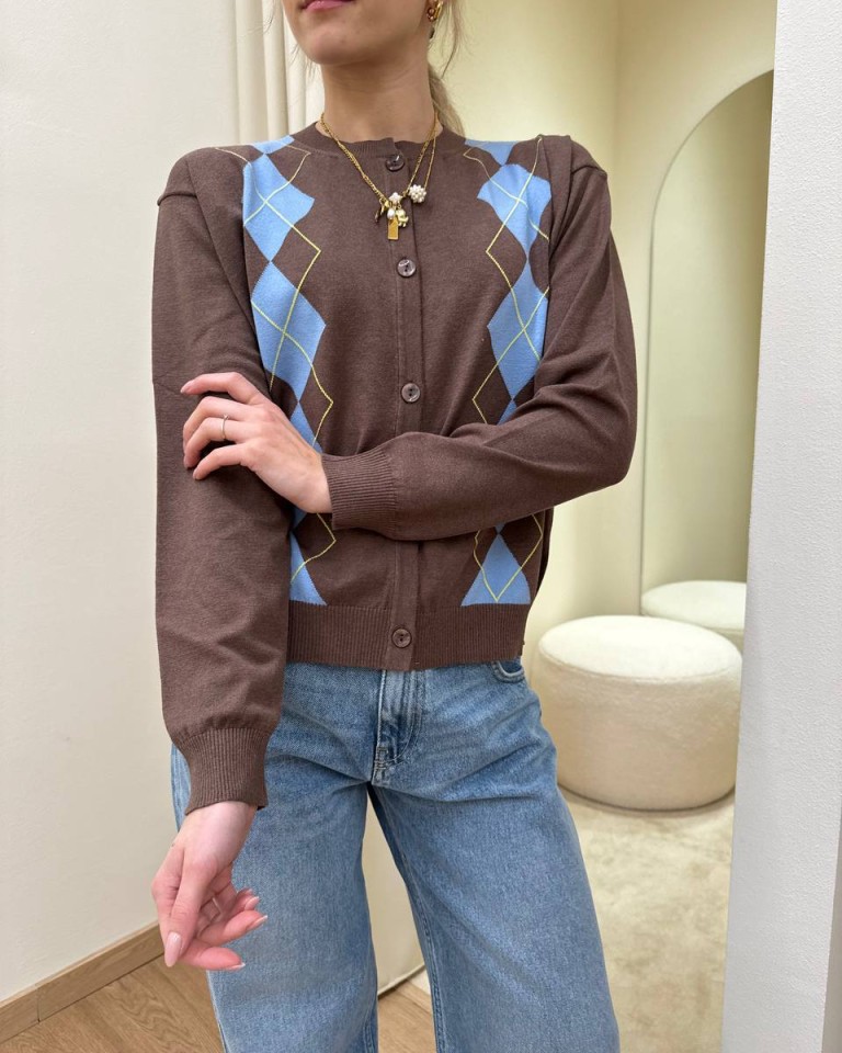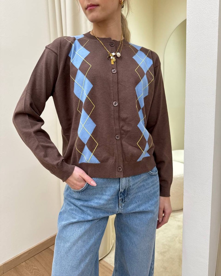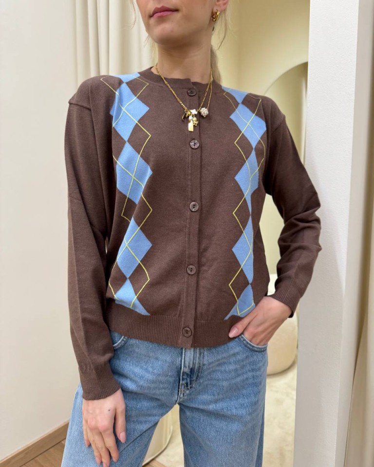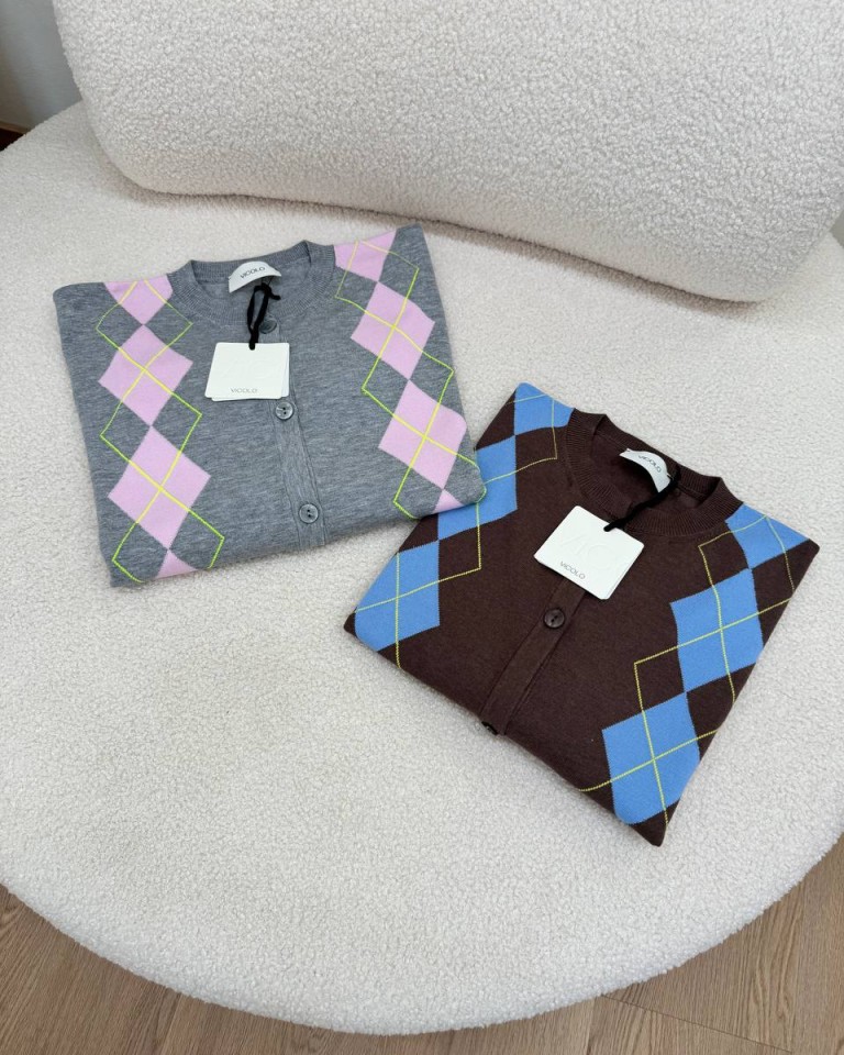 Cardigan in maglia moro con intarsio rombi carta zucchero e lime. Modello over, girocollo, maniche lunghe e bordi a costine su polsi, scollo e fondo. Vestibilità ampia.